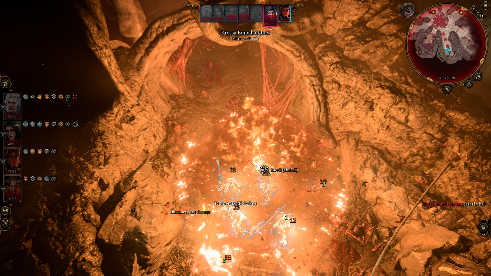: The party gets fireballed, which at this point is a mere annoyance that we can fix with one of our probably 40 good healing potions.
