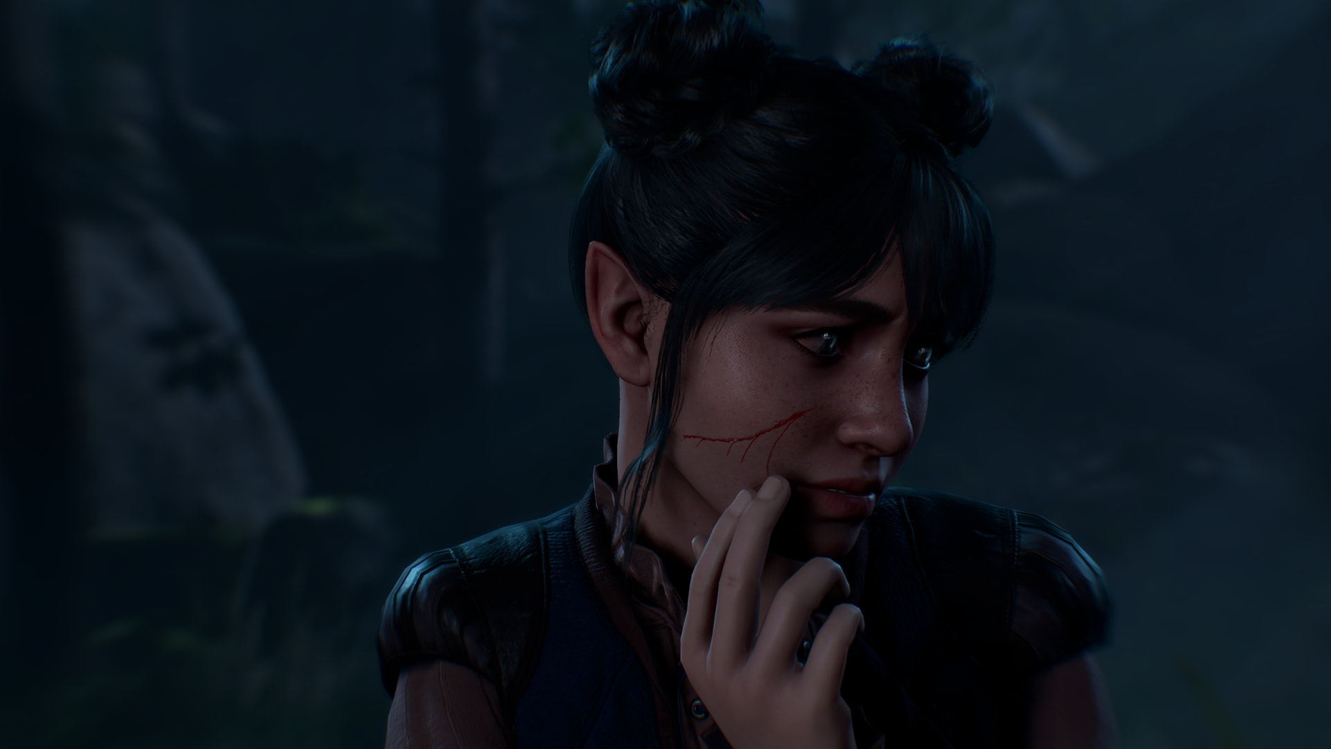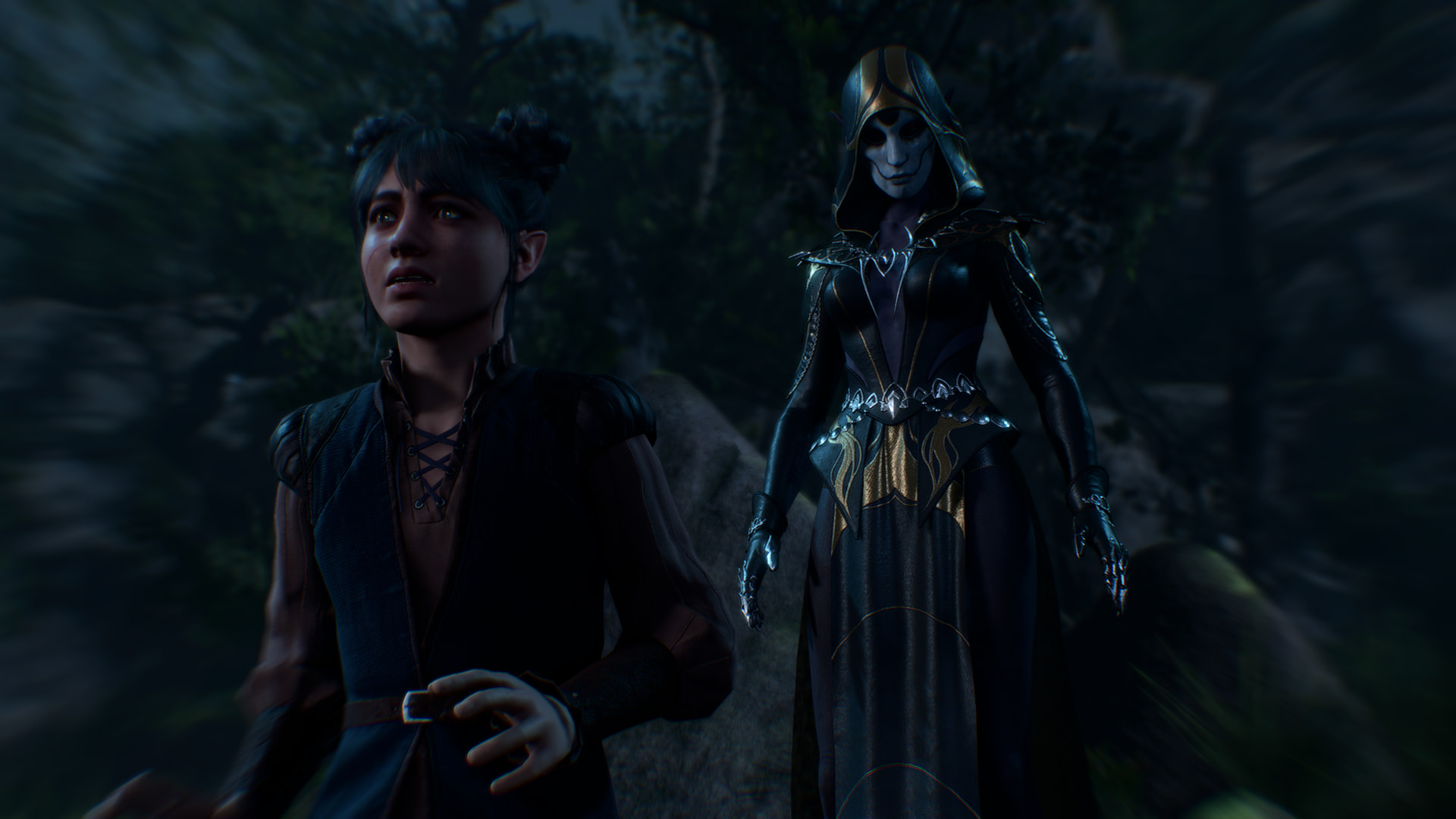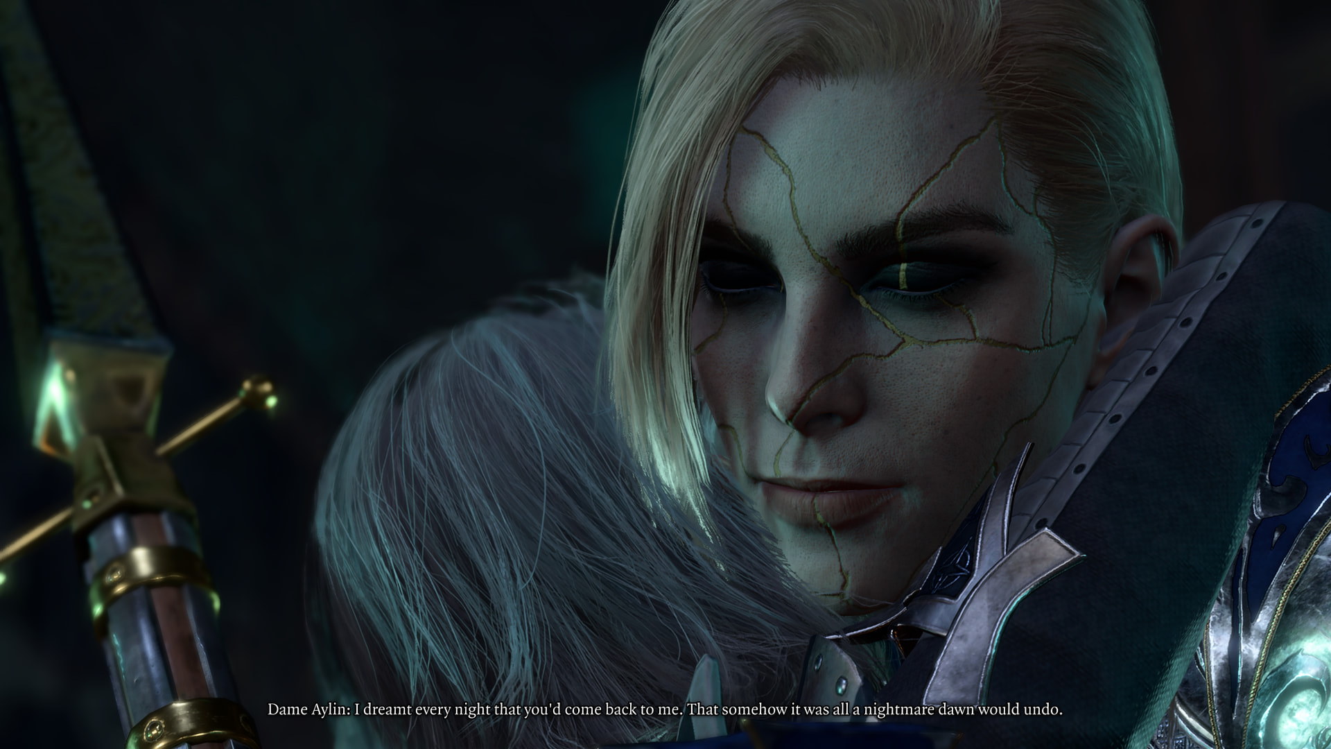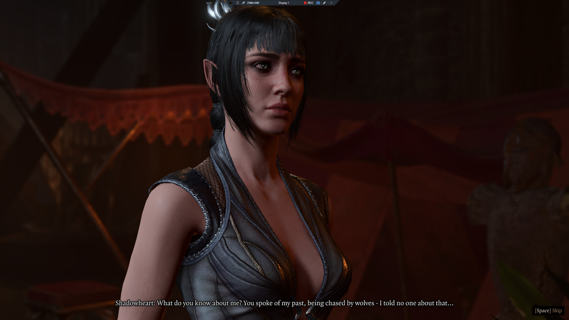 : “What.. who was that man?” : “You already know. Did you not see yourself in him? Do you not recognize your own blood?” : “My father? That was him?” : “That is him. He lives still, and your mother too.” : “No, it can’t be. I’m an orphan.” : She reminds me of this girl I went to high school with who’s even sparklier than I am. She went through a goth phase even though she had rainbow hair. : There are people.. sparklier.. than you? I need a drink. : I’m maybe a six out of ten on the sparkle scale. : “And who told you that? Your adoptive family? You are not to blame. You were young, impressionable. They took you because they wanted to break and remake you. But you are a child no longer. You are a woman. One who knows what must be done.” : “My parents. I need to save them.”Narrator: You remember that it is a common rite amongst Selune’s followers to send their children off into the woods to find their way home. Perhaps this time, it had gone awry. It seems that one child never came back. She was taken.