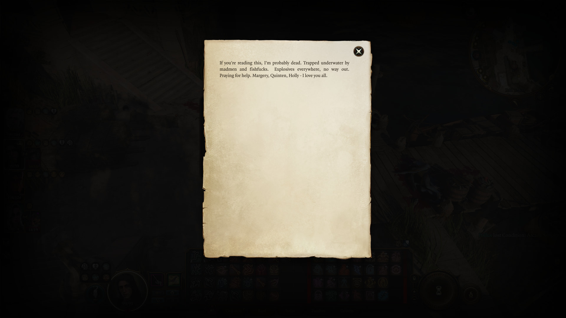 If you’re reading this, I’m probably dead. Trapped underwater by madmen and fishfucks. Explosives everywhere, no way out. Praying for help. Margery, Quinten, Holly - I love you all.