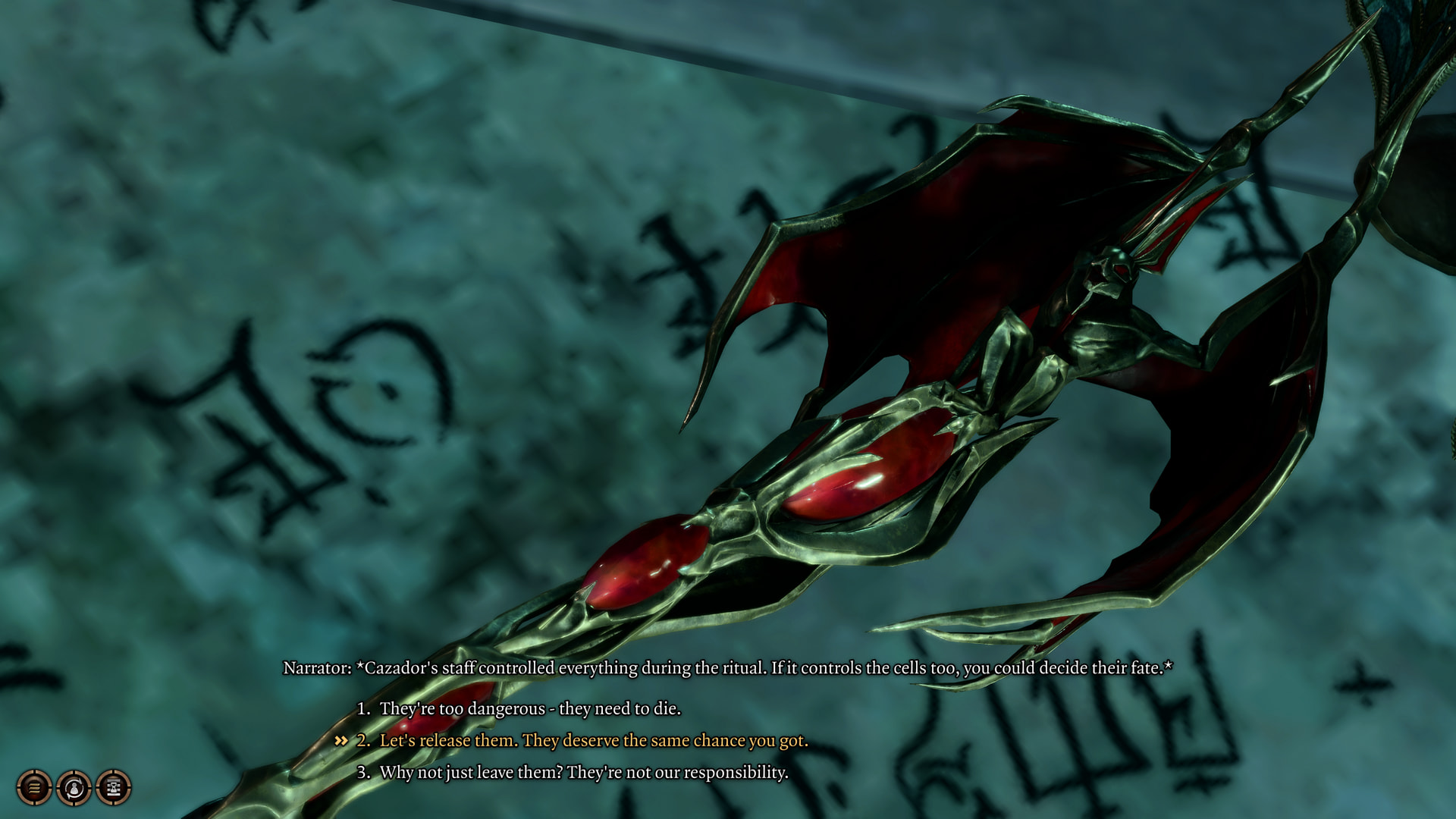 Narrator: “Cazador’s staff controlled everything during the ritual. If it controls the cells too, you could decide their fate.”