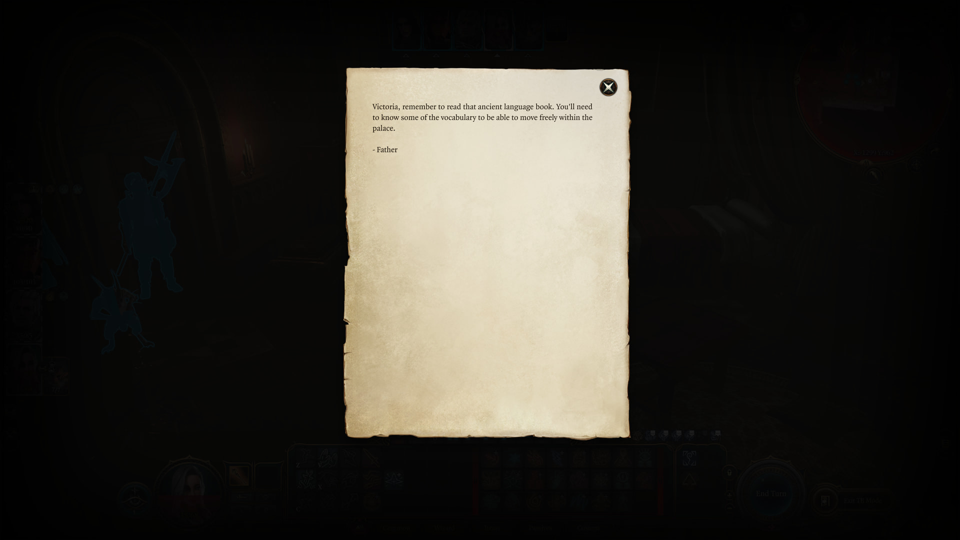 : That’s an idiotic way to run a palace. Mine has one locked door, and it’s the one to my vault. I’ve never had a problem with security. : Because of the giant demon elephant, right? : You should see the looks on their faces. : “This is where I took our ‘guests’. I’d entertain them here, until Cazador appeared and.. took them away. No one ever died here, though. Something strange happened to that girl.”Victoria, remember to read that ancient language book. You’ll need to know some of the vocabulary to be able to move freely within the palace.