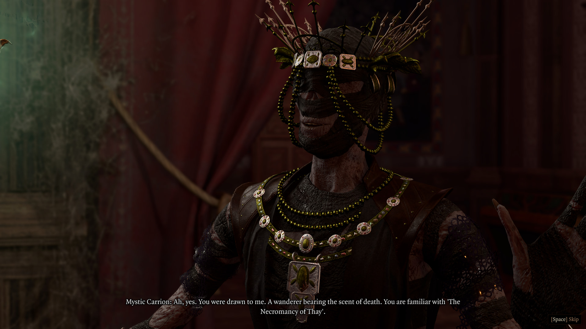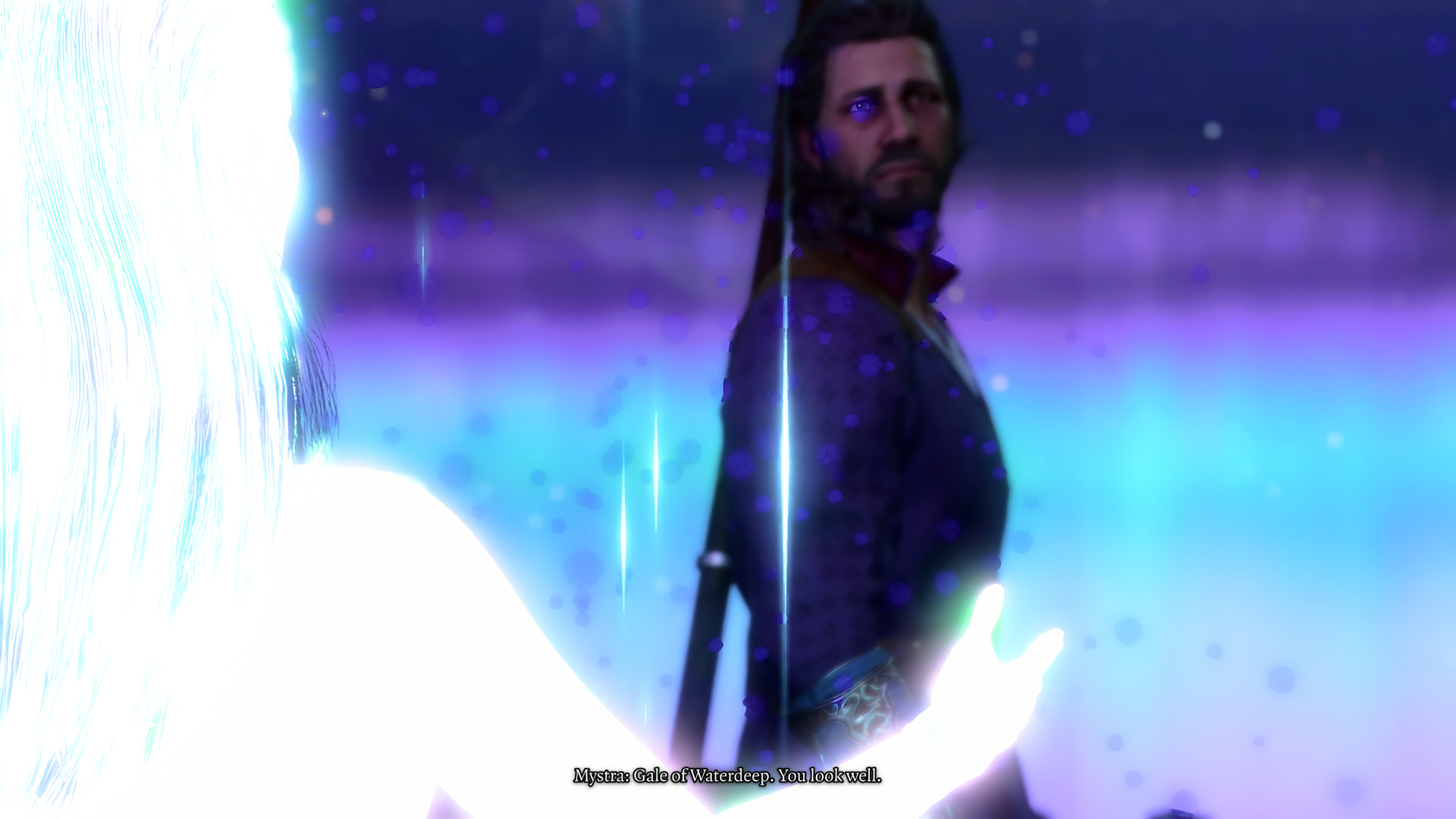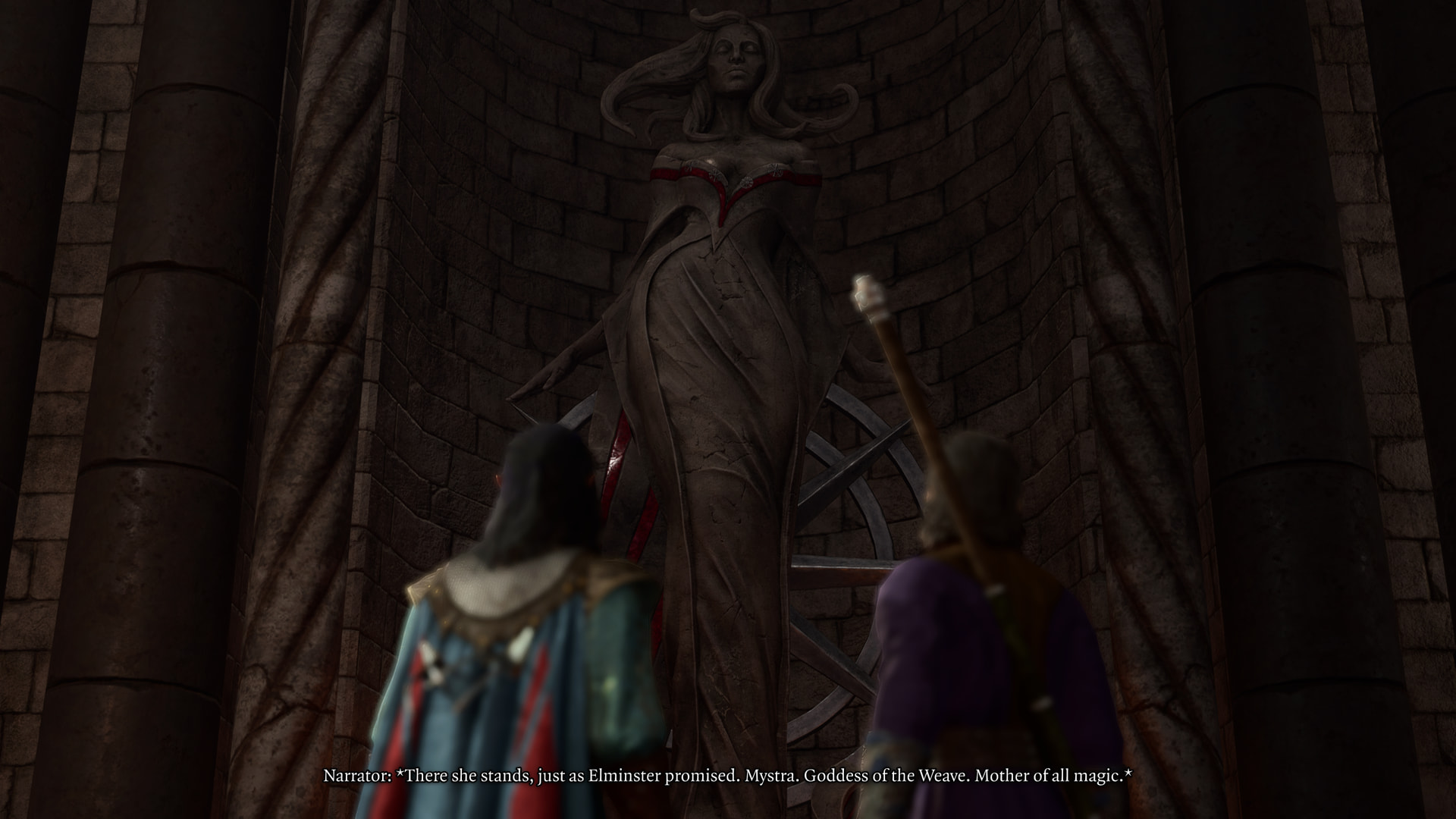 : “A stream of pure, undiluted Weave. I only have to reach out, and it will carry me to Mystra, wherever she may be. Time was, I’d have given my right arm for a chance to speak with Mystra again. The left one too. Maybe a knee..”Narrator: “Gale’s right. The very air around the statue crackles with magic. It sets your teeth on edge.”