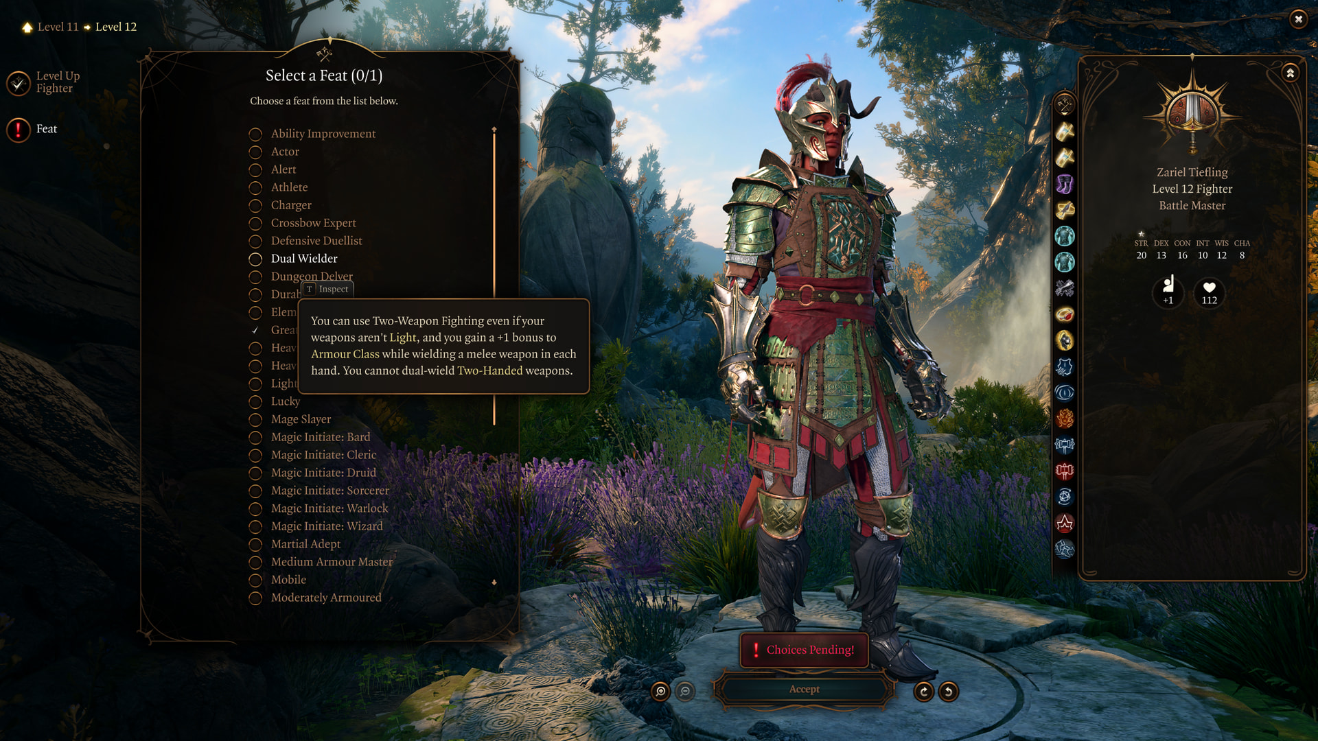 : Originally, I was going to give Pollux a level in storm sorcerer. However, there’s something even better we can do. If we make him a 12th-level Bard, we can use his feat to get Dual Wielder.