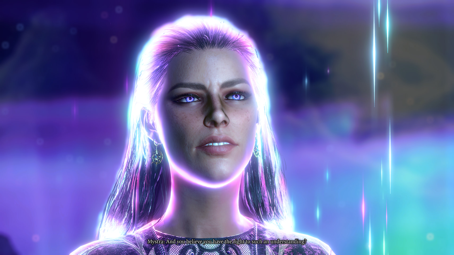 Narrator: “There she stands, just as Elminster promised. Mystra. Goddess of the Weave. Mother of all magic.”