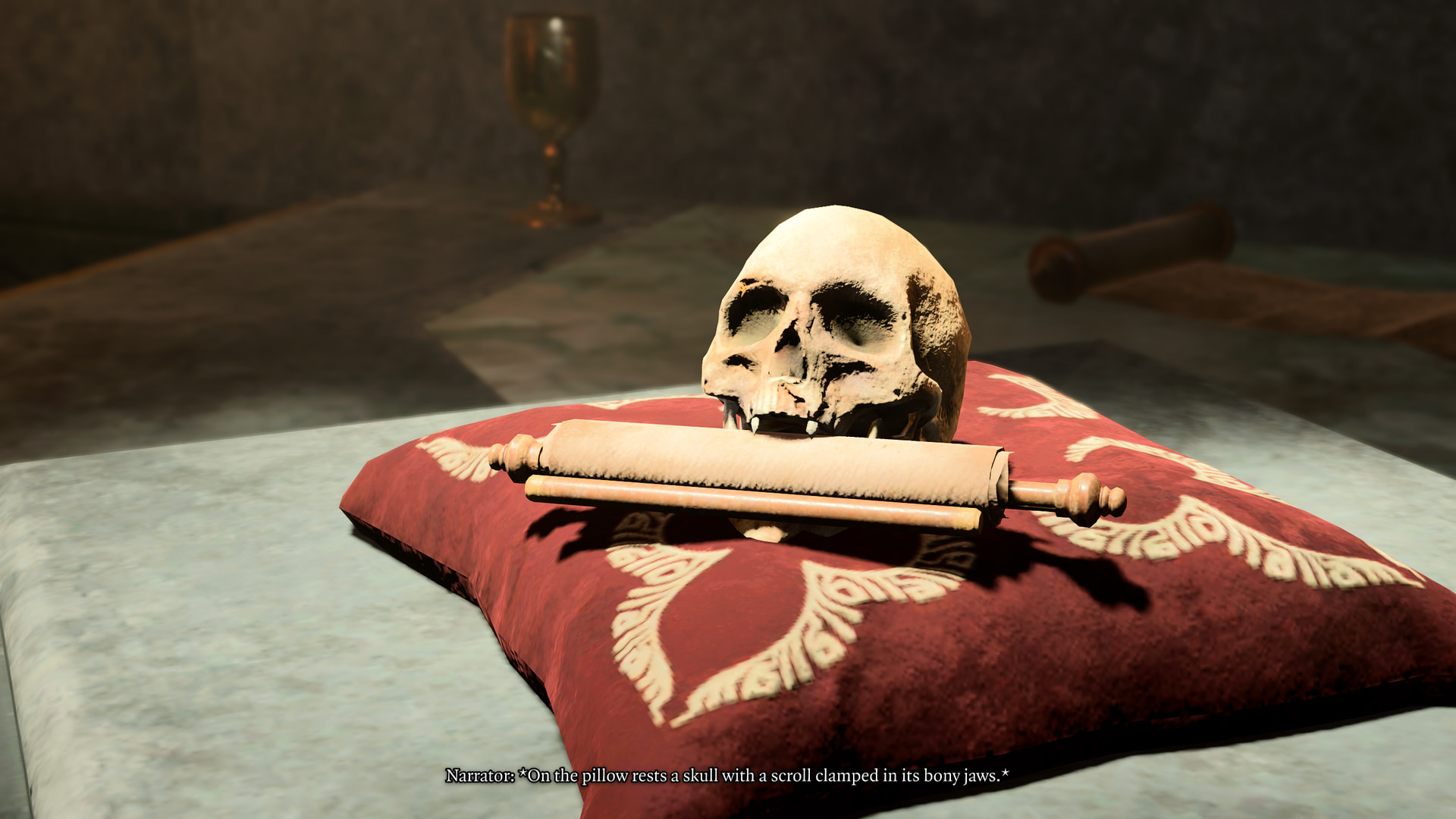Narrator: “The door is engraved intricate text, but you can’t see anywhere a key might fit - only a small, round hollow engraved with a family crest.”
