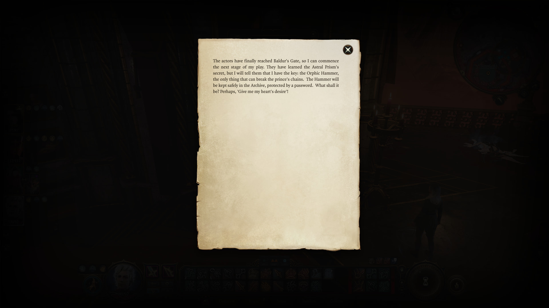The actors have finally reached Baldur’s Gate, so I can commence the next stage of my play. They have learned the Astral Prism’s secret, but I will tell them that I have the key: the Orphic Hammer, the only thing that can break the prince’s chains. The Hammer will be kept safely in the Archive, protected by a password. What shall it be? Perhaps, ‘Give me my heart’s desire’!