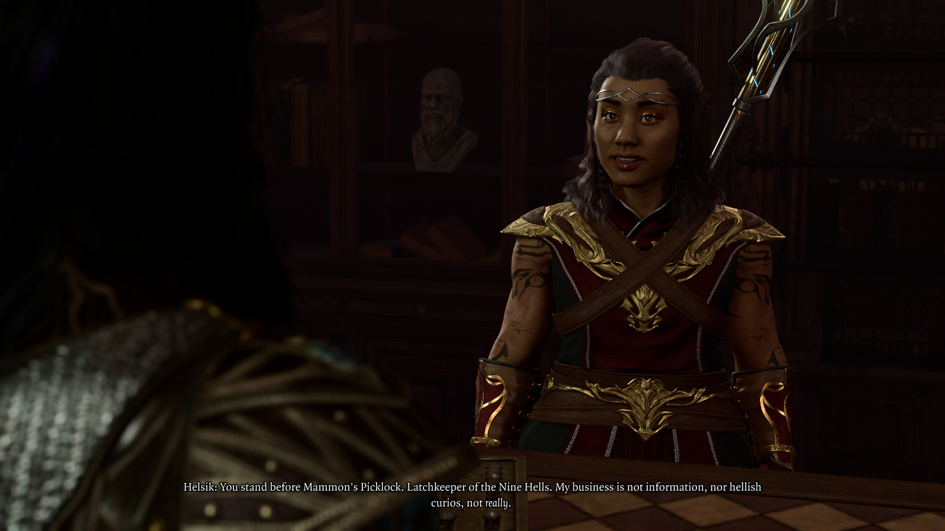 : “A guest? Are you a client of the master, or a visitor from elsewhere in the Hells? I do not believe you were invited. One moment - I shall consult the guest book.”