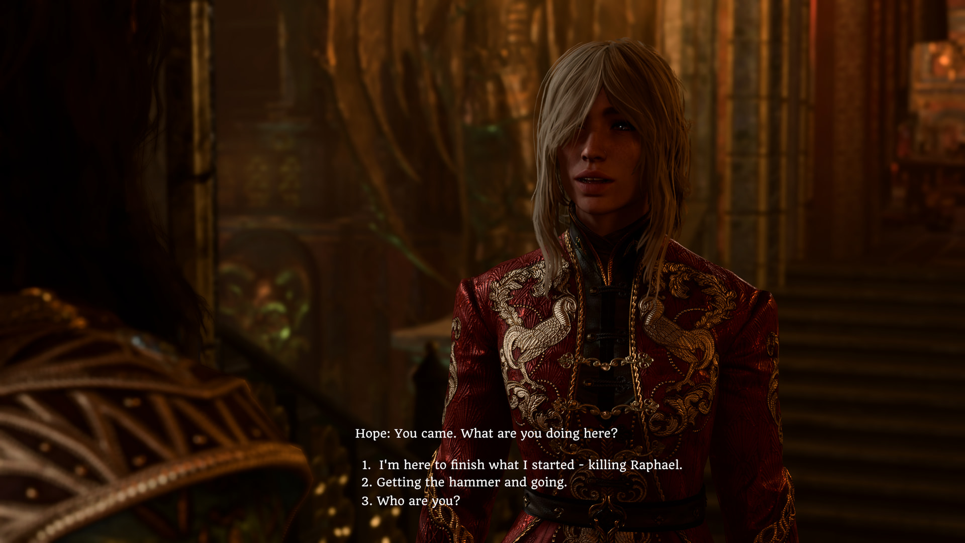 : I should mention that if you need to leave, there are several things that trigger Raphael returning. One is attacking any of the sinners, which we’ve already done. Attacking the Archivist is another, as is picking up the hammer and freeing Charlie Hope.