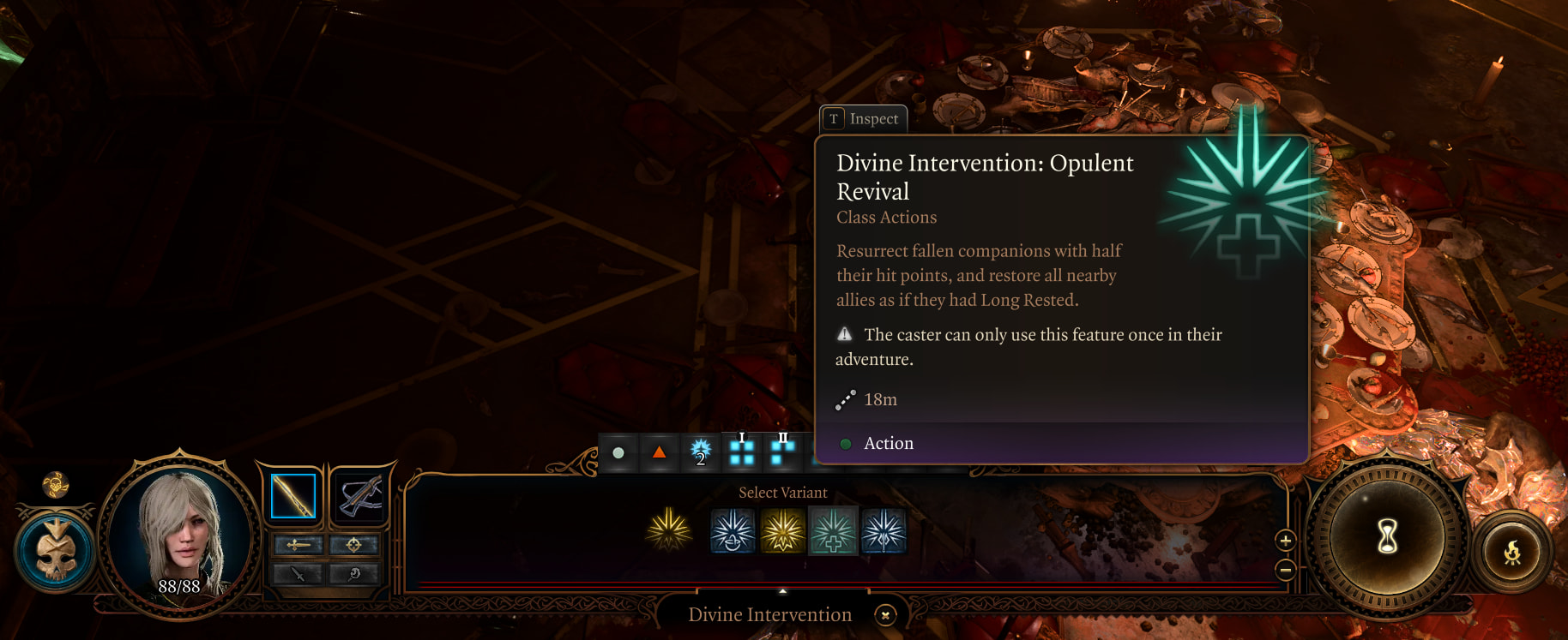 : The second is Divine Intervention. It has four possible uses, but this one is by far the best. It regenerates all spell slots, and since Hope is a temporary party member, there’s no reason not to use it.