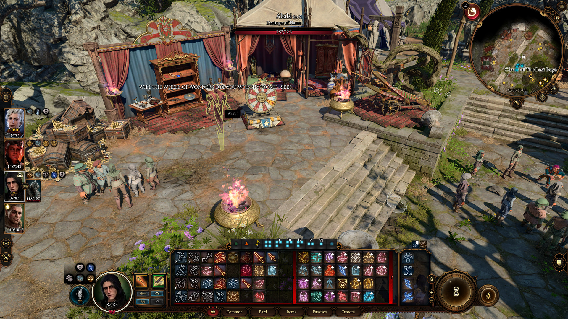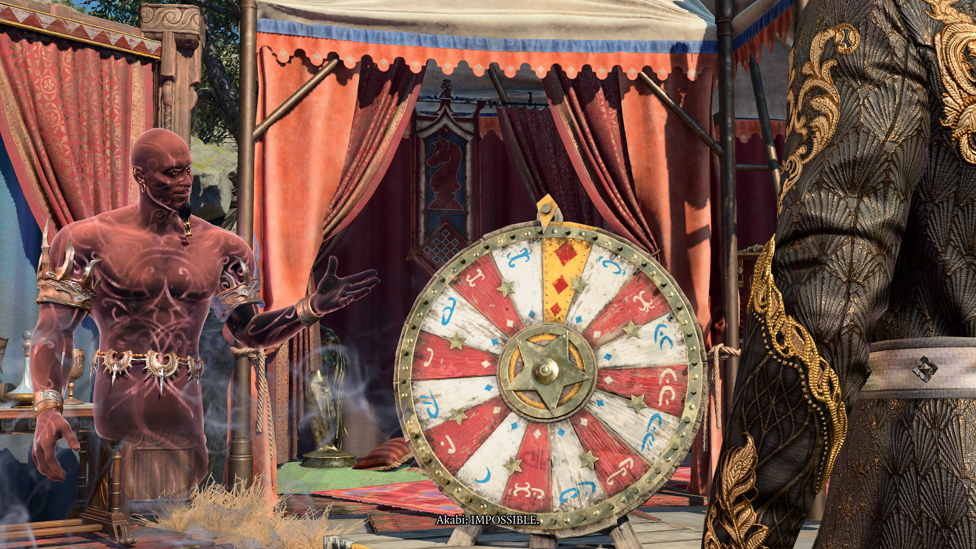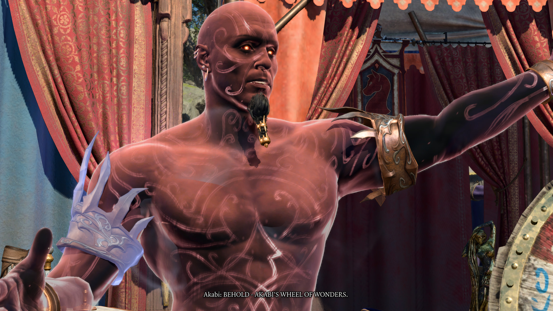 : His gimmick is that he’s a loud asshole who has a prize wheel that costs 500 gold to spin. Like all carnival games, this is rigged against us.