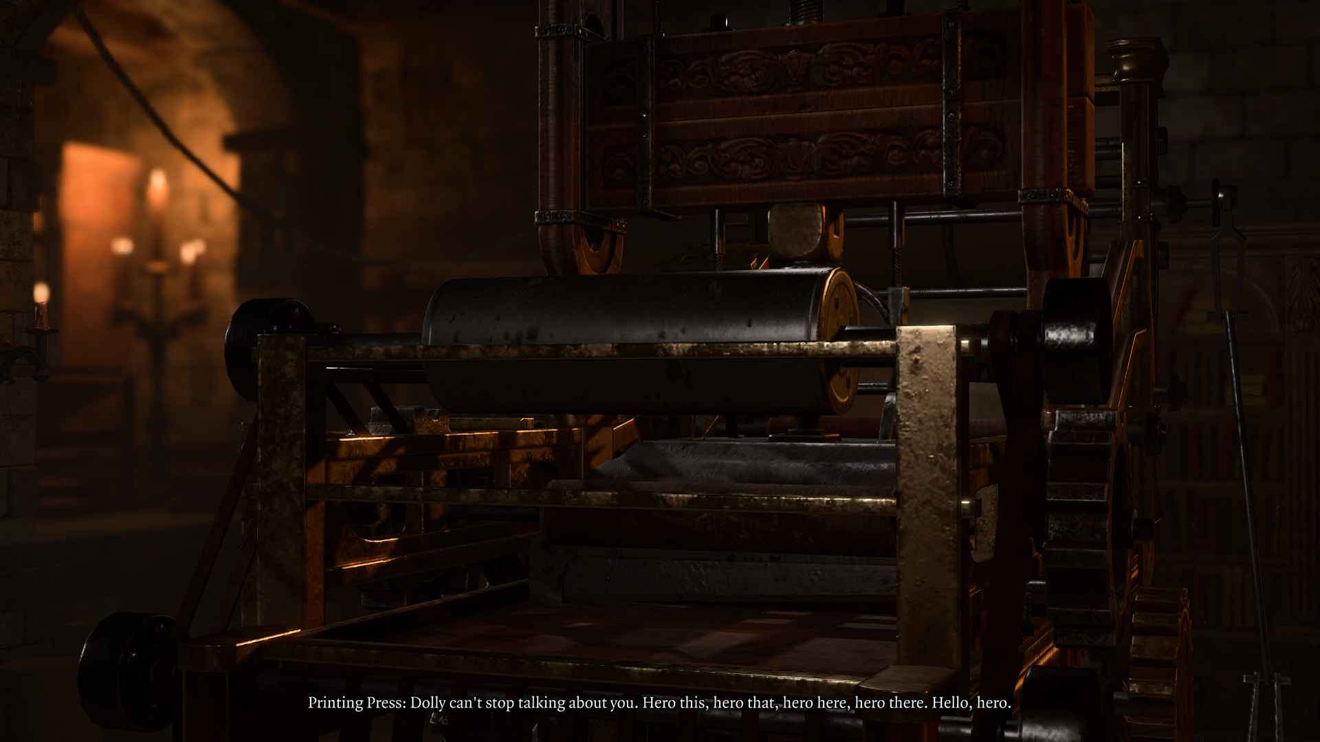 : Down the hall is a magic talking printing press. The printing press will know who you are if you saved the pixie in Act 2.