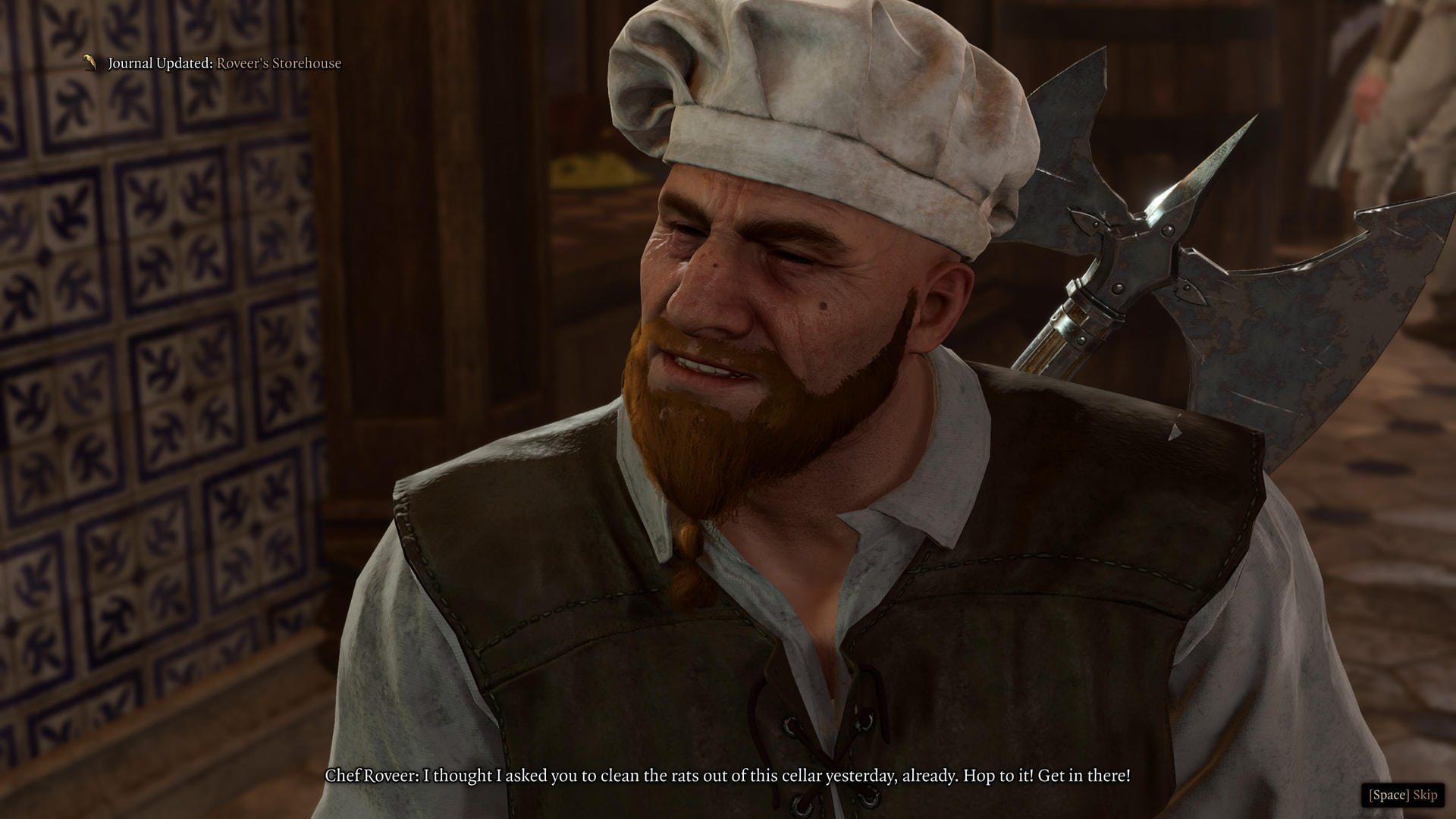 : The chef is one of the murder victims off that list, and he has a dumbass quest for us that exists solely to be a BG1 reference.