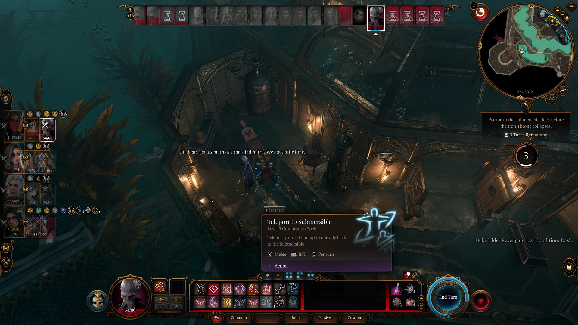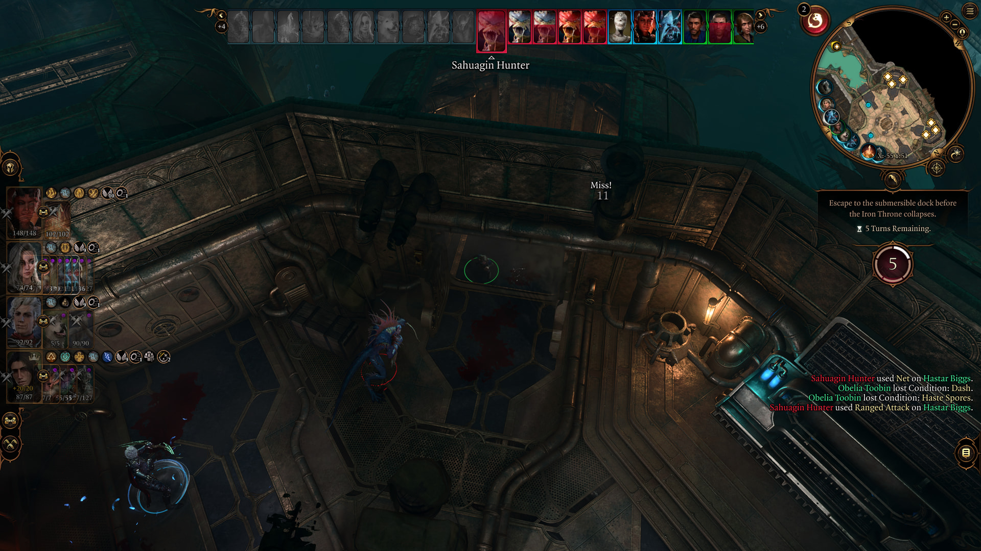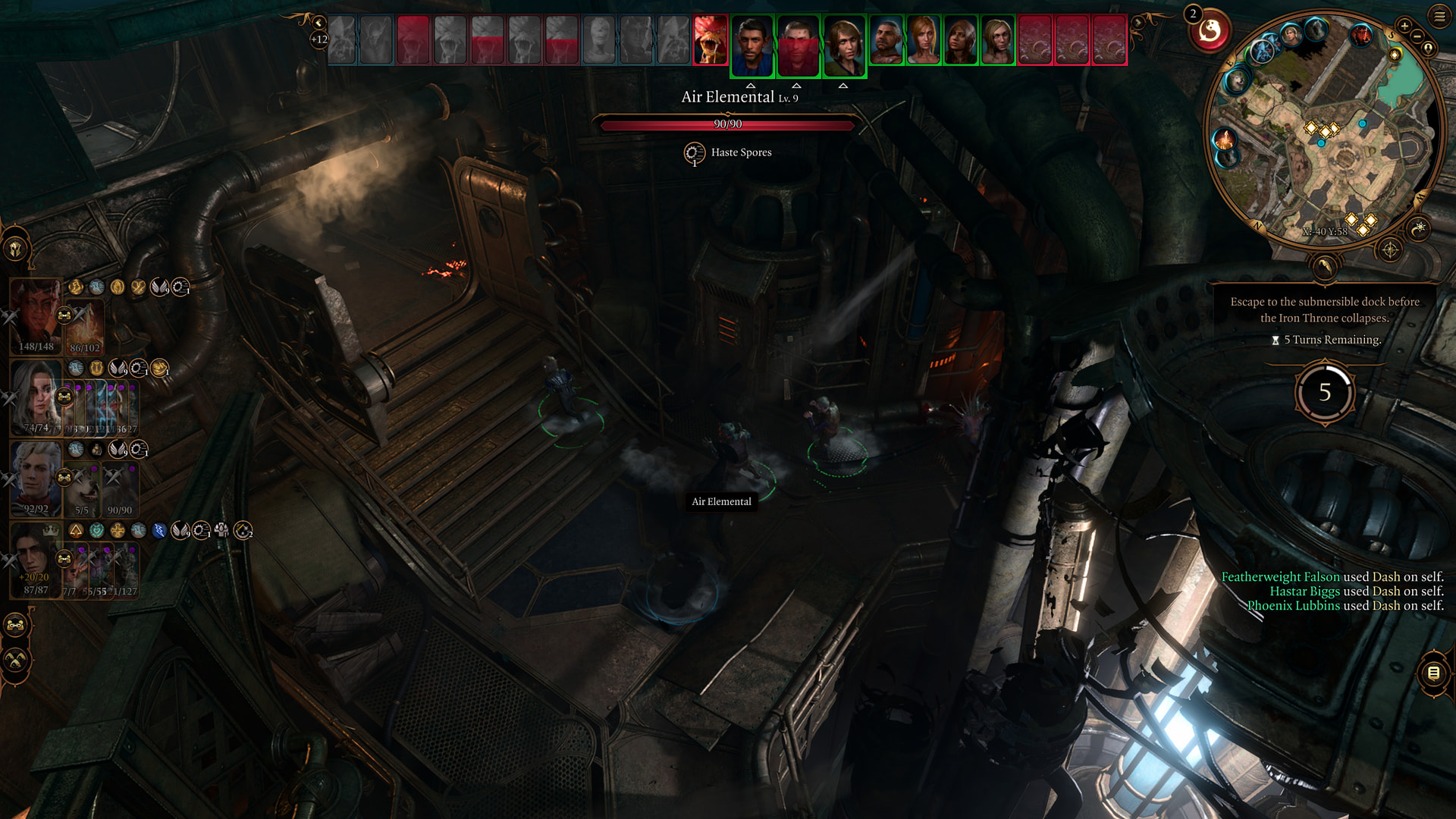 : What? Where’s my segment? : This calls for a superhero. You’d just blow the place up for laughs. : Our first play is having the person with the spore grenade throw it. Even though the grenade says it lasts three turns, that’s misleading. The cloud it generates lasts for three turns, but the haste effect only lasts for one. : It might be tempting to fly down the ladder, but don’t. Fly to the ladder instead, use it, and then fly to your destination. Ladders don’t cost movement, but flying does. : A classic four-way intersection. We have a prisoner here.. : And another back here. In an emergency, delegating responsibility is key. Don’t waste your party’s turn freeing them when the summons can do that. : This hostage is free and will be able to save herself. Behind her is the route to the mind flayer. : This route is the one we want to send our fastest character down. It has two prison cells full of slow-moving hostages who need at least three turns to escape to safety.Omeluum: “Act with speed. Act with efficiency. Good luck.”