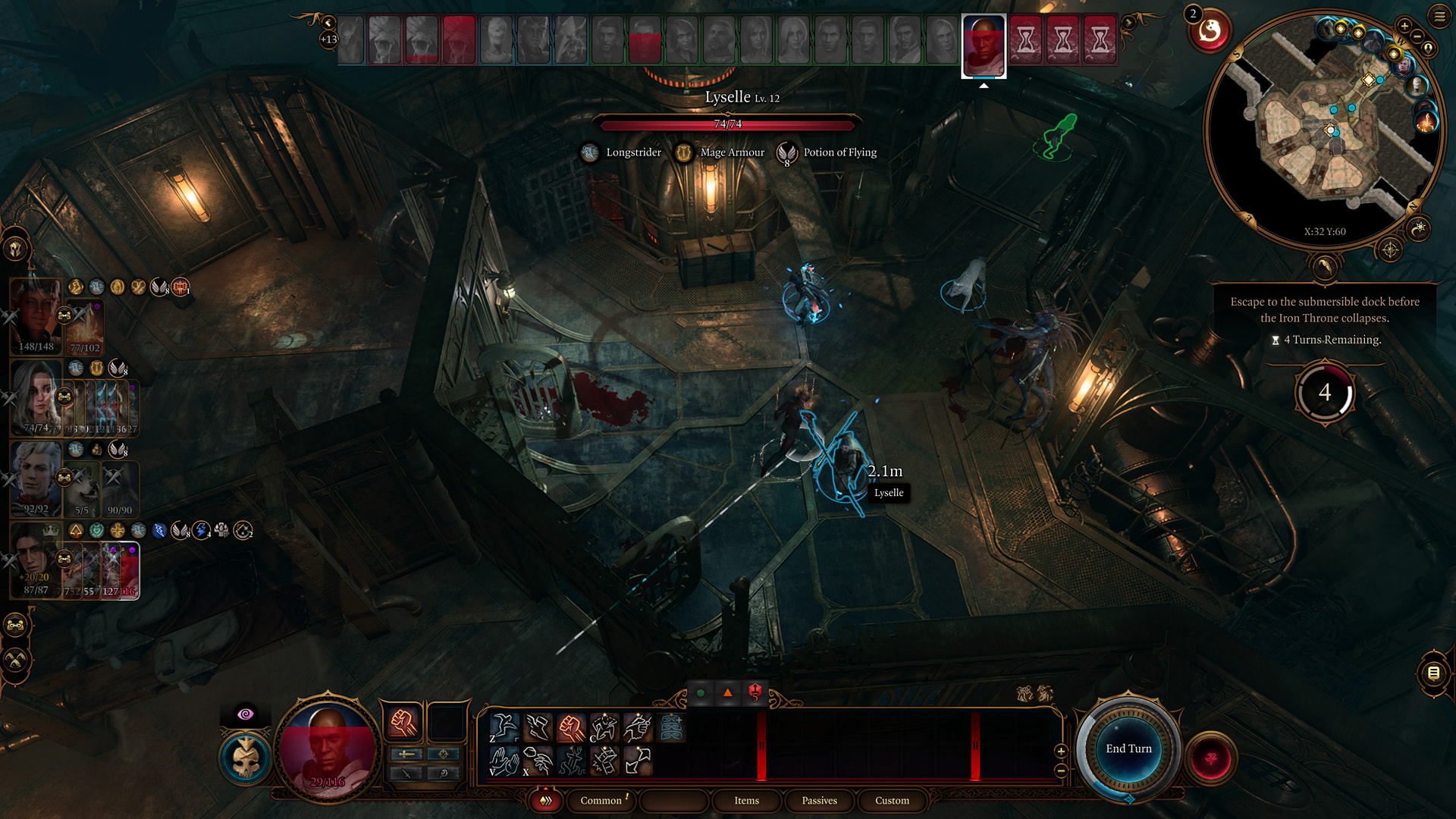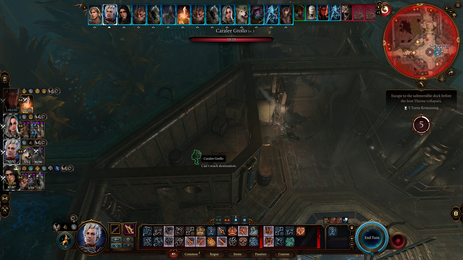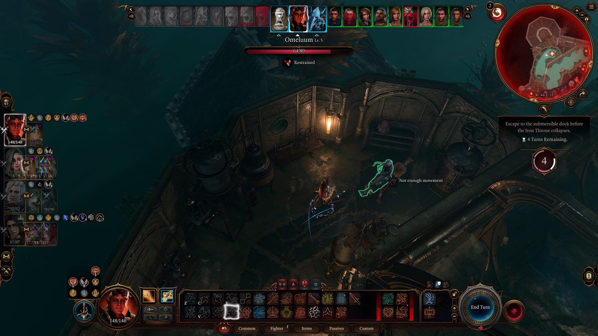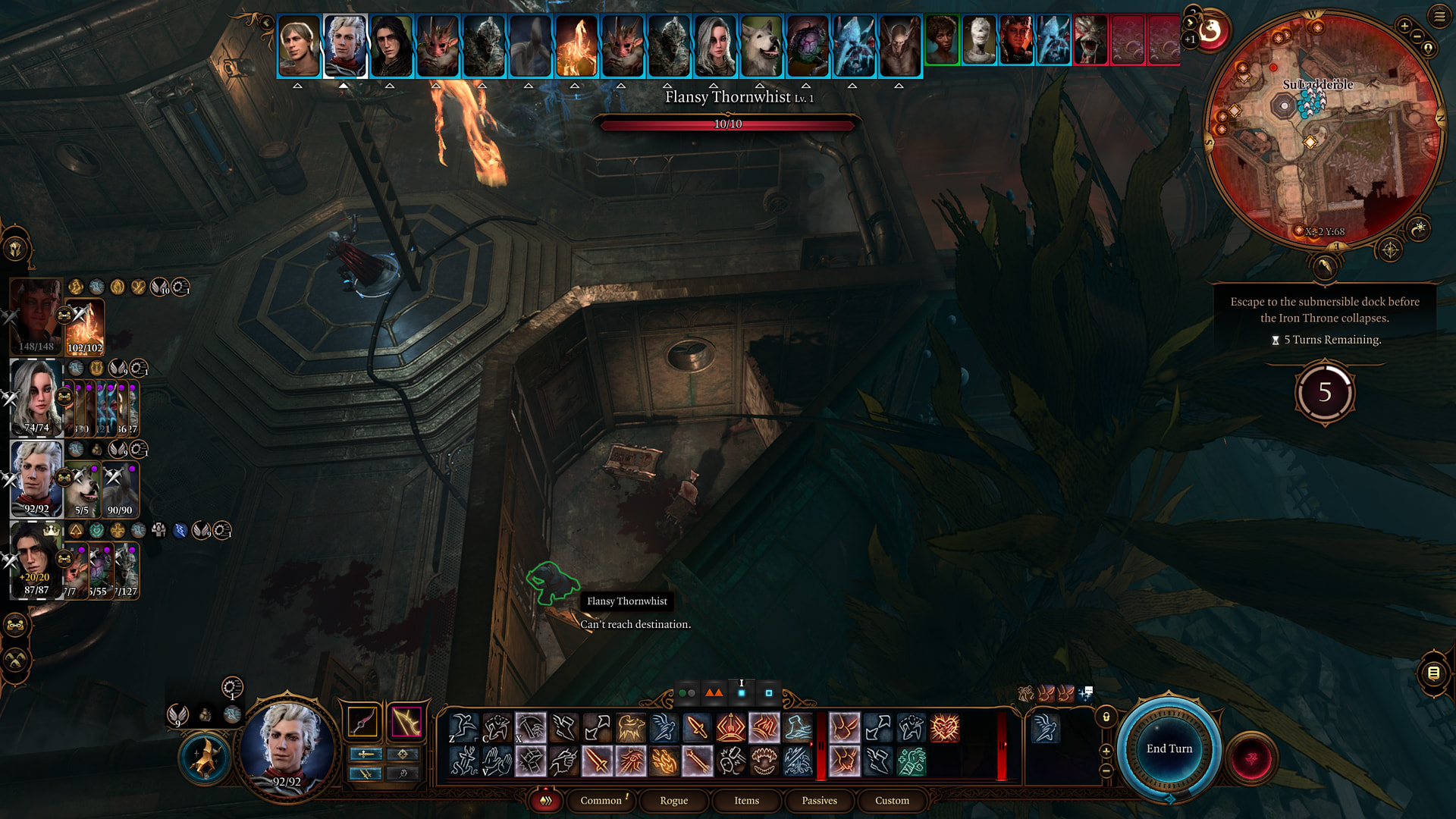 : What? Where’s my segment? : This calls for a superhero. You’d just blow the place up for laughs. : Our first play is having the person with the spore grenade throw it. Even though the grenade says it lasts three turns, that’s misleading. The cloud it generates lasts for three turns, but the haste effect only lasts for one. : It might be tempting to fly down the ladder, but don’t. Fly to the ladder instead, use it, and then fly to your destination. Ladders don’t cost movement, but flying does. : A classic four-way intersection. We have a prisoner here.. : And another back here. In an emergency, delegating responsibility is key. Don’t waste your party’s turn freeing them when the summons can do that. : This hostage is free and will be able to save herself. Behind her is the route to the mind flayer. : This route is the one we want to send our fastest character down. It has two prison cells full of slow-moving hostages who need at least three turns to escape to safety.Omeluum: “Act with speed. Act with efficiency. Good luck.”