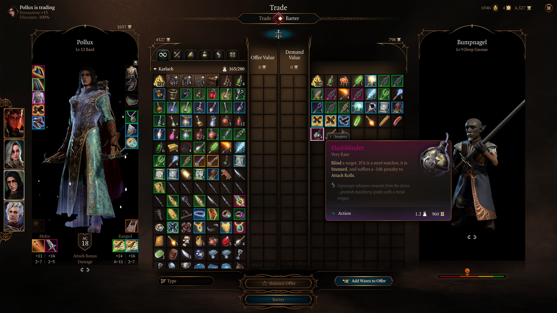 : First, we want to buy four of these flashblinder grenades off this gnome. He restocks every time you long rest, and these grenades are the only way to fight the boss we’re about to go up against.