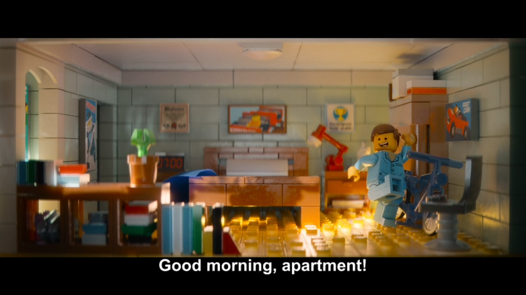 8 1/2 years later, we meet Emmet Brickowski (Chris Pratt) waking up in his apartment in the Lego city of Bricksburg. He starts off his day just like everybody else by reading the instructions and going by his daily routine, starting with breathing, exercise, showering, and getting dressed before having breakfast with the important people in his life…or in Emmet’s case, his plant. He sees an ad from President Business (his professional persona) representing his company, Octan, and reminding everybody to follow the rules and whispering that they’ll be put to sleep before cheerily reminding everybody about Taco Tuesdays. Emmet briefly hears the bit about putting people to sleep before his, and everybody else’s, favorite sitcom, “Where Are My Pants?”, starts playing, in which the main joke is a guy asking his wife where his pants are, yet Emmet finds this hysterical.