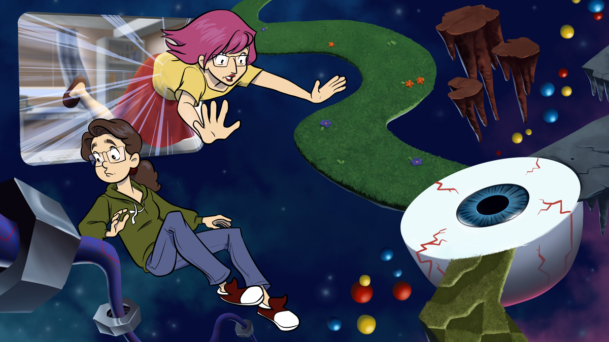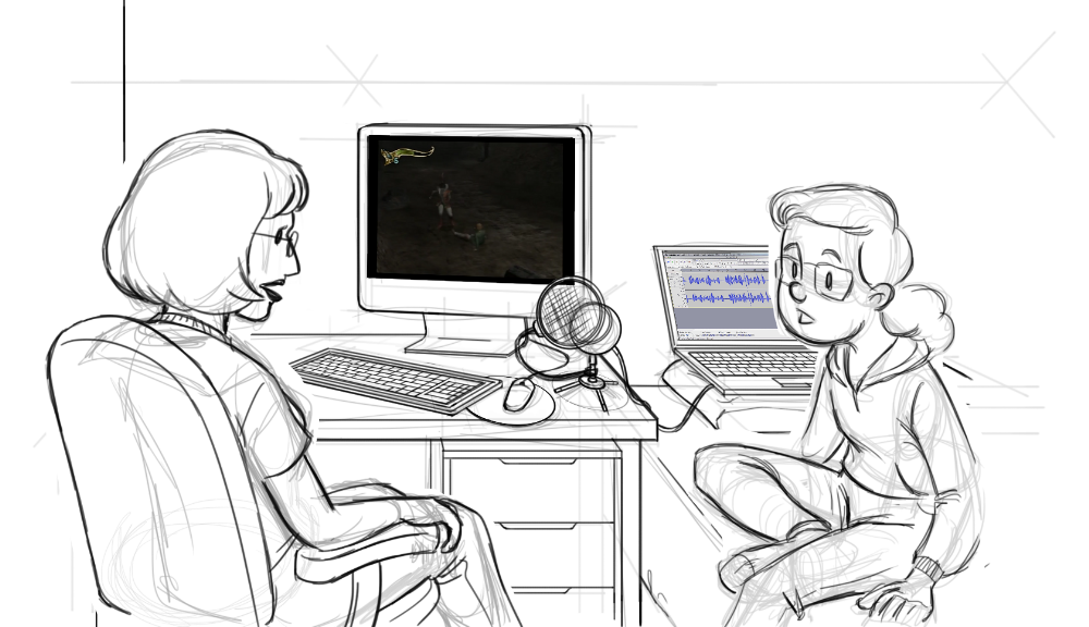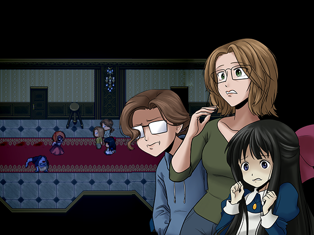 This is the first titlecard done by GenghisKait! The rule of thumb is any pixel art is done by her, any digital painting or traditional drawing is done by me. We usually try and match up the titlecard to the game, so any game heavily featuring pixels will likely have the titlecard done by Genghis. I did help by providing Genghis a 3D mock up of the room and figures though (I provided moral support too).