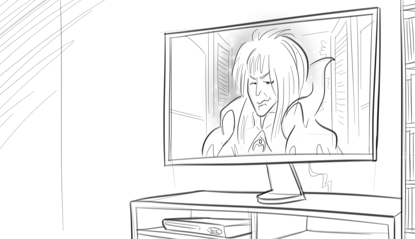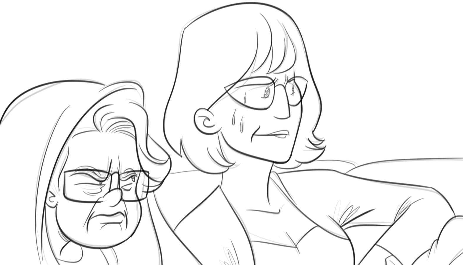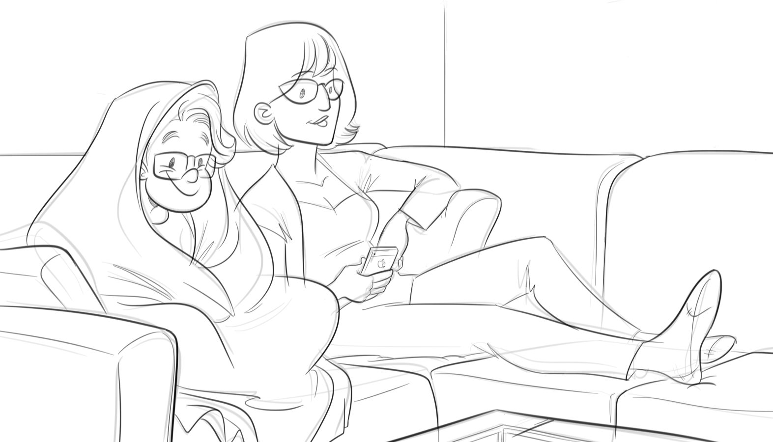 Photo reference is a great help, don’t ever let anyone tell you that you shouldn’t/can’t use it. Did you catch my subtle hint that I used photo reference for this one? Because I used a lot of photo reference. I also used Sketchup to model the room environment so I could try out a few different angles before settling on this one. That Sketchup model ended up being pretty handy as I got to reuse it for a few later titlecards as well. I also started using MangaStudio’s 3D model tool to pose 3D figures to help me figure out how the characters could sit in the scene. My blending is way better in this titlecard, I must’ve discovered the airbrush tool in Sketchbook Pro.