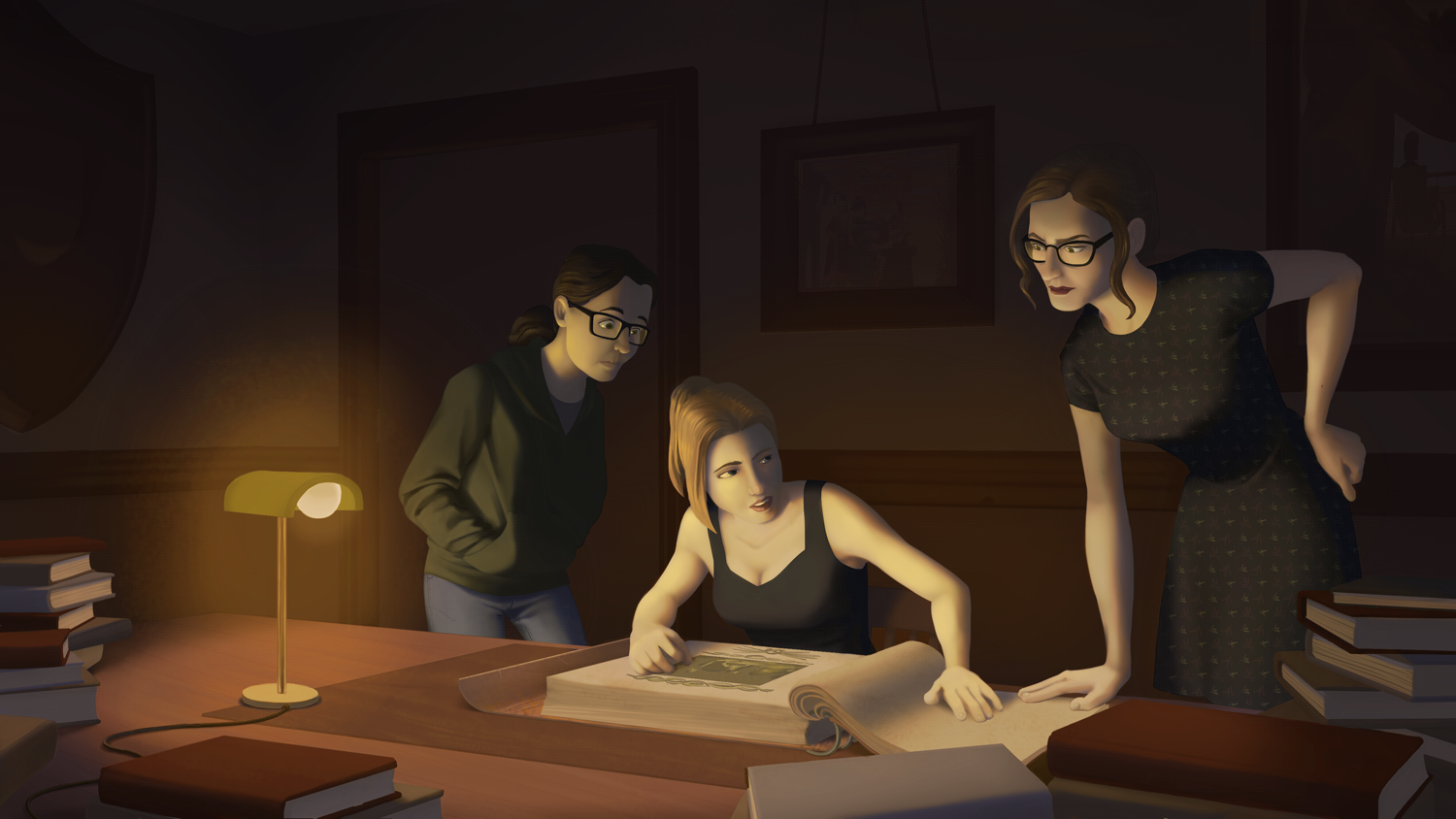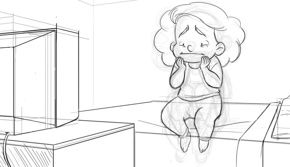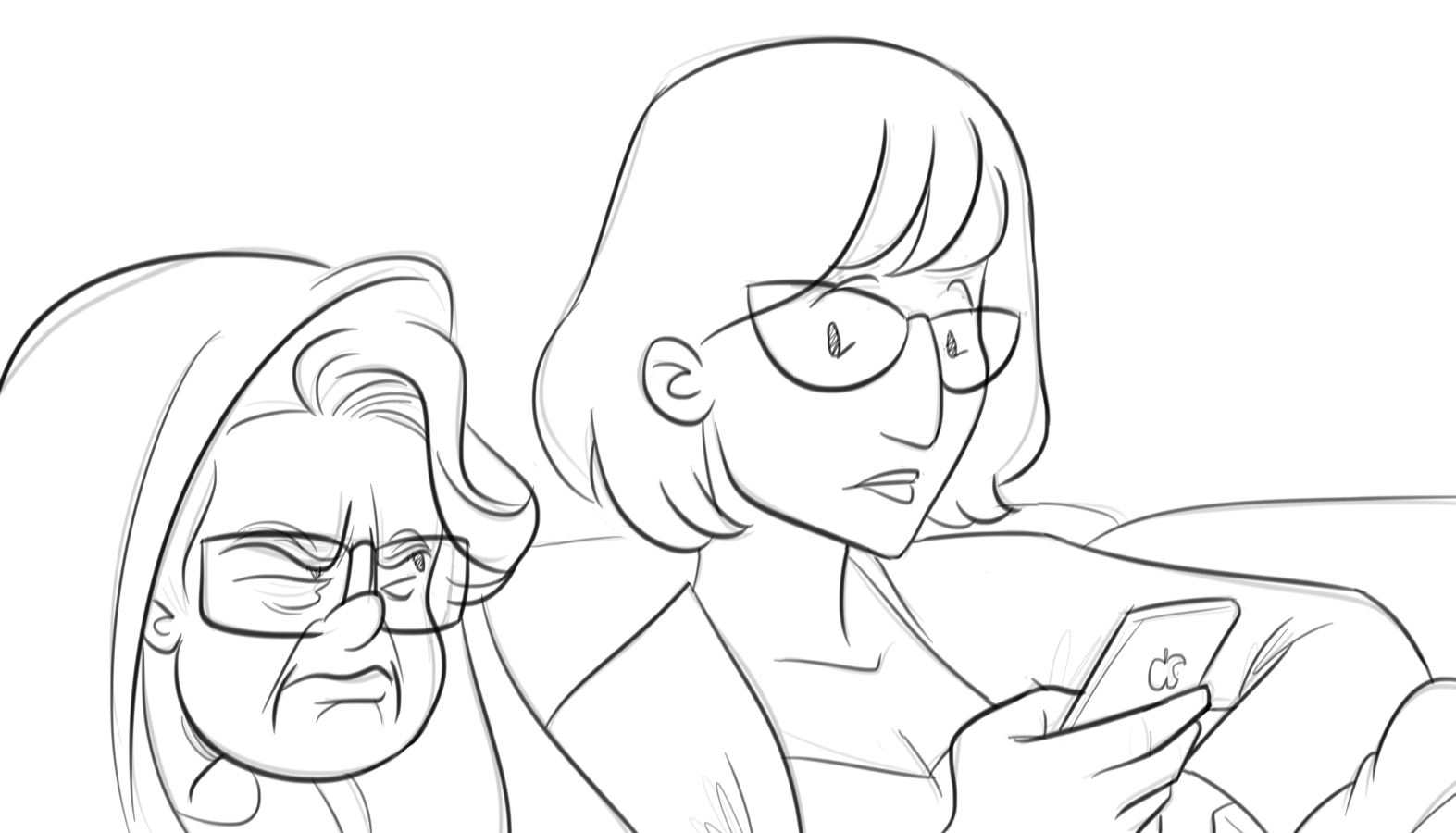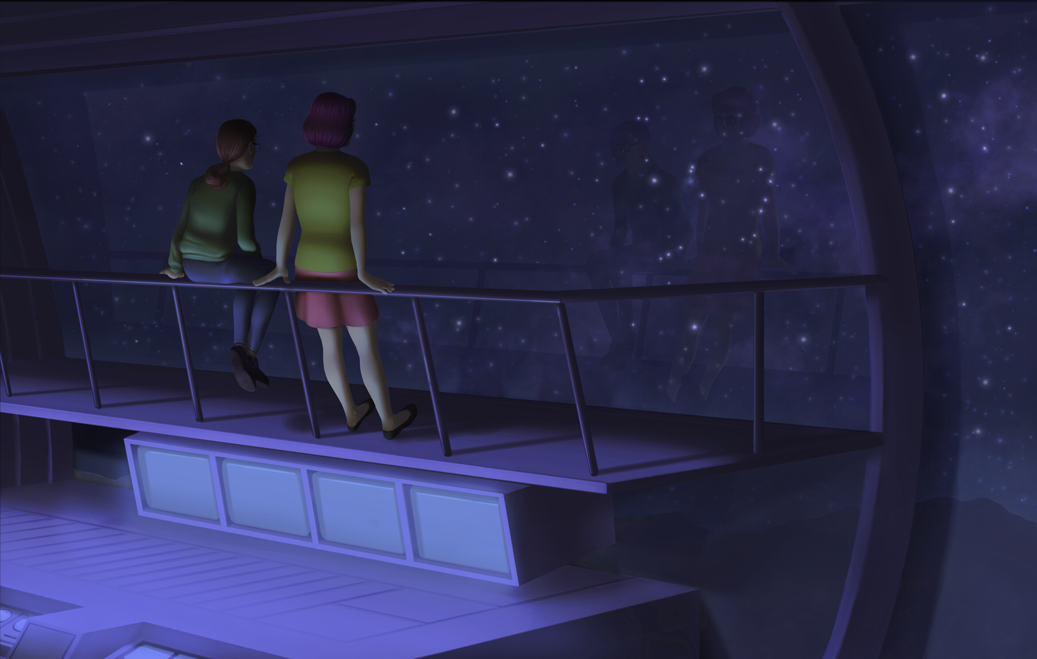 Photo reference is a great help, don’t ever let anyone tell you that you shouldn’t/can’t use it. Did you catch my subtle hint that I used photo reference for this one? Because I used a lot of photo reference. I also used Sketchup to model the room environment so I could try out a few different angles before settling on this one. That Sketchup model ended up being pretty handy as I got to reuse it for a few later titlecards as well. I also started using MangaStudio’s 3D model tool to pose 3D figures to help me figure out how the characters could sit in the scene. My blending is way better in this titlecard, I must’ve discovered the airbrush tool in Sketchbook Pro.