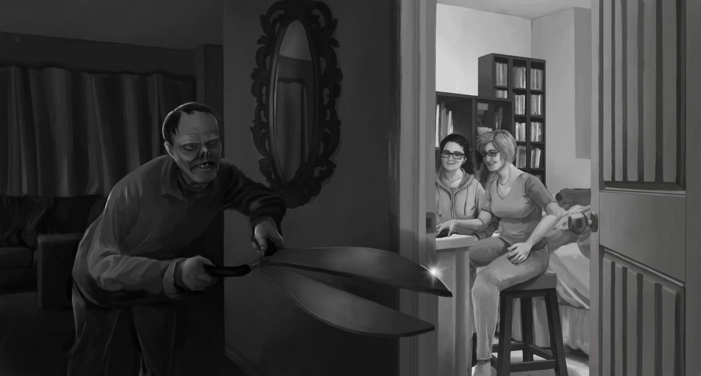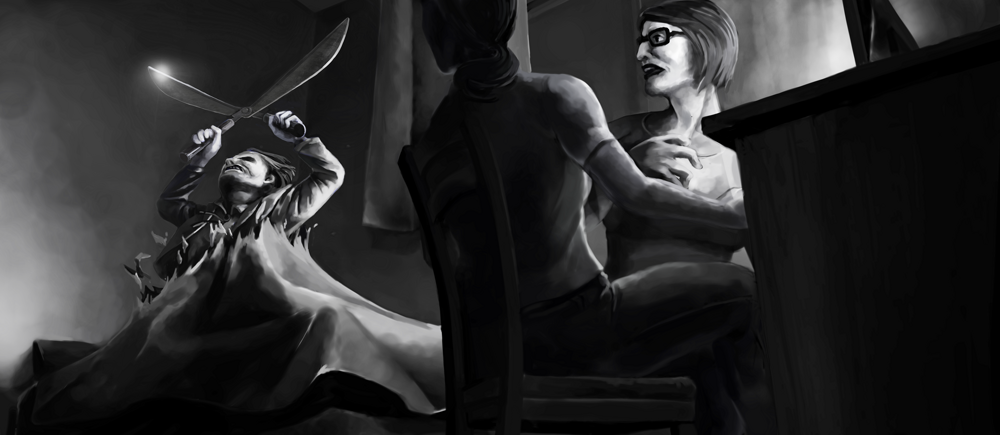 So in addition to the “pixel art equals pixel titlecard” thing, we also try and make the titlecard match thematically with the game. If it’s a serious game, serious title card. If it’s a goofy ass game like Clocktower 3, it gets a goofy ass titlecard. This one could’ve turned out better. There was intended to be a tiny hint of colour in this one. I hadn’t yet figured out how to apply colour to my greyscale under-painting and I wanted to add some colour, but it just wasn’t working out so it was removed. As a result I feel it’s very hard to tell what’s going on in this titlecard, which is that the doofy side character Dennis is menacing us, in lieu of any of the real villains of the game. I think if I was able to put a bit more colour into this one Dennis would’ve been a bit more recognizable, but I’ll also cop to the fact that this layout isn’t really the best way to stage the scene. I like the idea of this titlecard, but I don’t like the execution.
