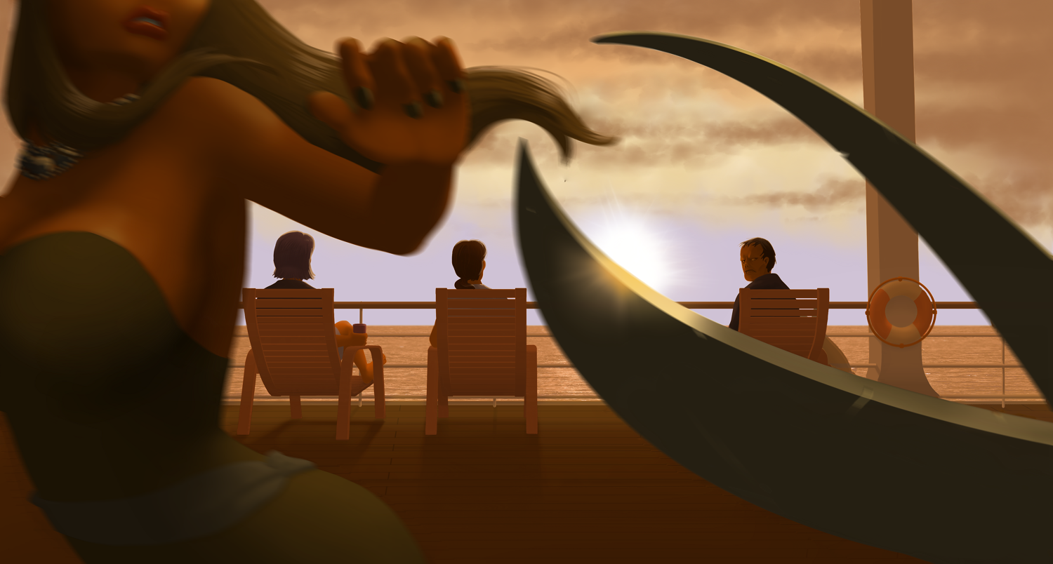 This game, oh lord this game. We knew this game would be nutso, but little did we know how nutso it would get! I feel like the titlecard isn’t zany enough for what the game turned out to be. Special cameo by Scissorman on the rightmost deck chair there. GenghisKait gives me crap because she thinks I drew him hunky, I think she’s trying to blame some weird attraction she has to Scissorman on me.