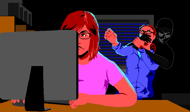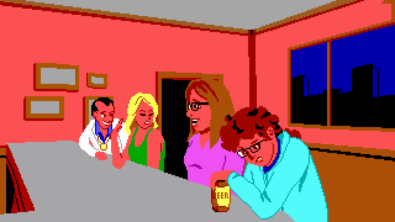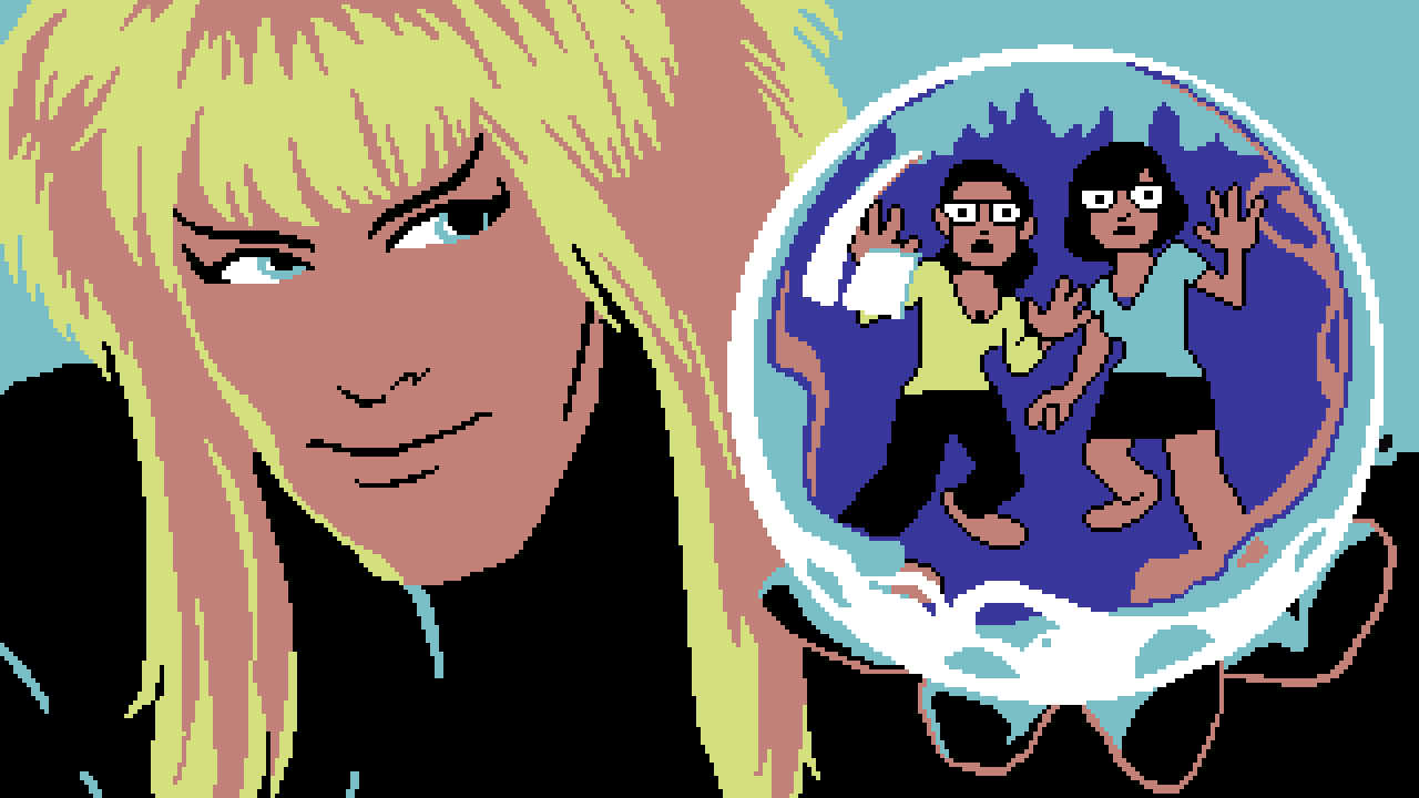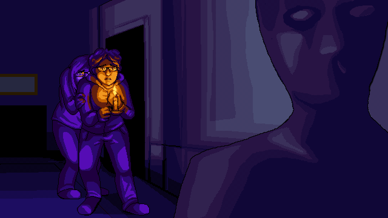 Genghis really gets to show off her pixel art chops here, as a result this is one of my favourite titlecards. I do have to deduct points for the unrealistic content though, for I am a small flabby woman-child and there’s no way that I would be the one taking the lead following a spooky silhouette in a darkened hallway.