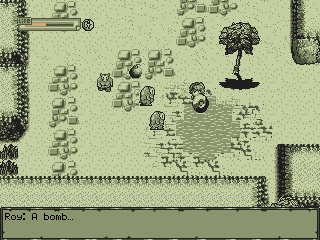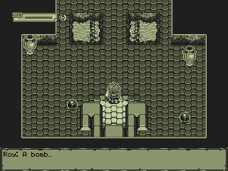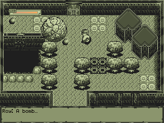 : The next dungeon is easy, but also badly designed. What we have to do is get that bomb in the bottom-right corner to the boulder in the top-left.