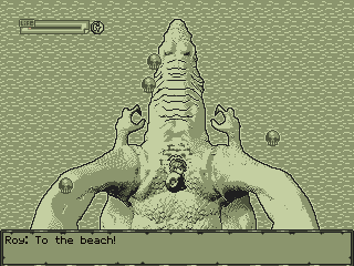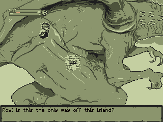 : Walking off the south side of this screen will deposit Roy back on the island. To get to the leg, you have to exit via a small number of pixels in the bottom-right, near the right-side wing.