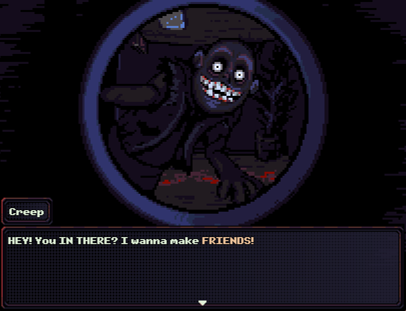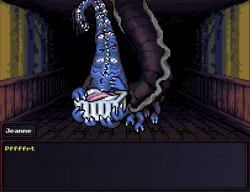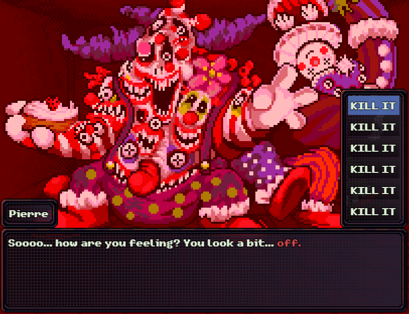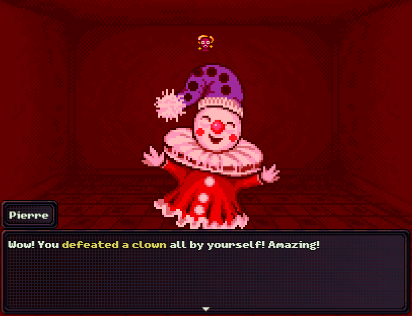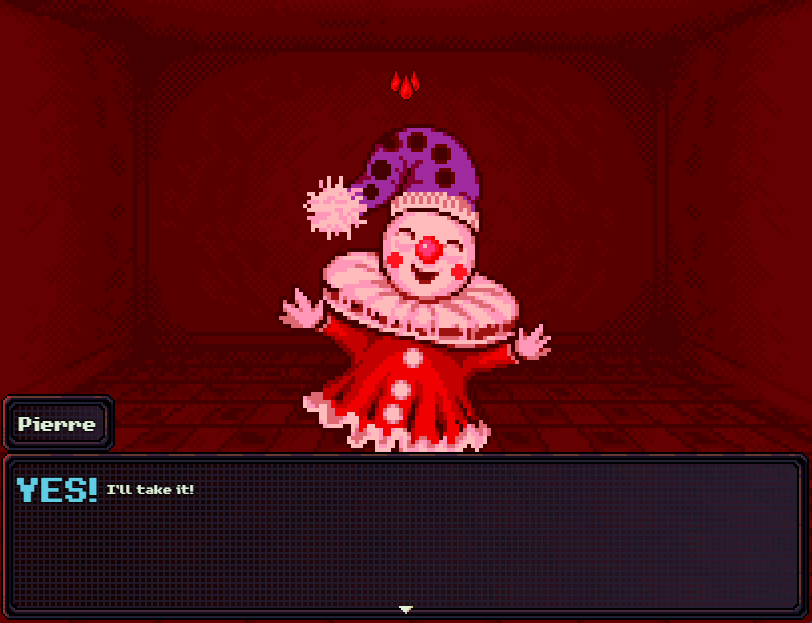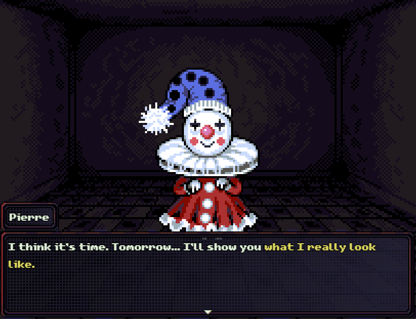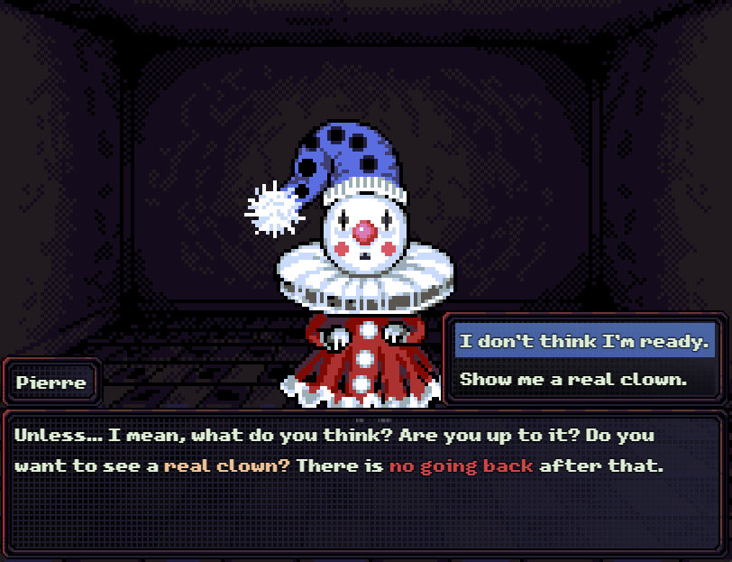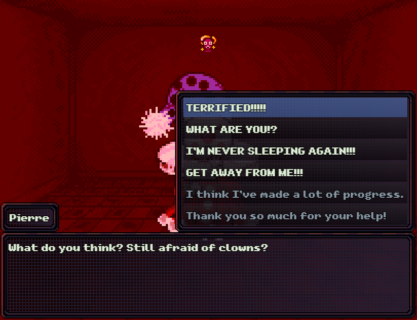 : “I’m so proud of you! You are really putting in the effort. Look at you, can you believe it? You just hugged a clown! Incredible! You only yelped once! and it was more of a whimper, really.” : “You will never fear clowns again. That’s my promise! I can’t wait! I’m so excited!” : Let’s never come back. : “Alright! Here goes. It’ll feel really good to finally get to stretch out a bit. Can you close your eyes for just a moment? It’s a little embarrassing to do in front of somebody.”You give Pierre a hug. Something feels weird about him. His body seems completely inhuman. Weird moving lumps. You feel a set of teeth at his back, under the robe. Limbs growing in all the wrong places. What the hell is he. What the hell is this? What are you doing. Are you in danger? Is this a trap? Will he eat you? You are in danger.