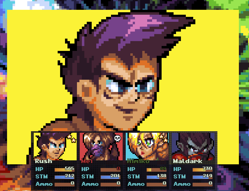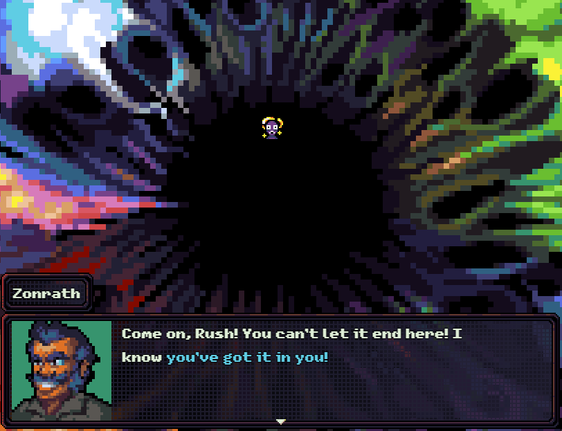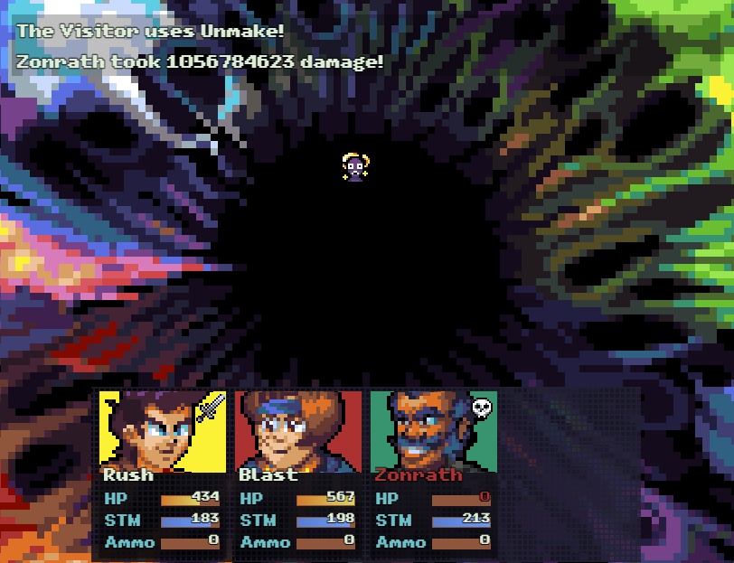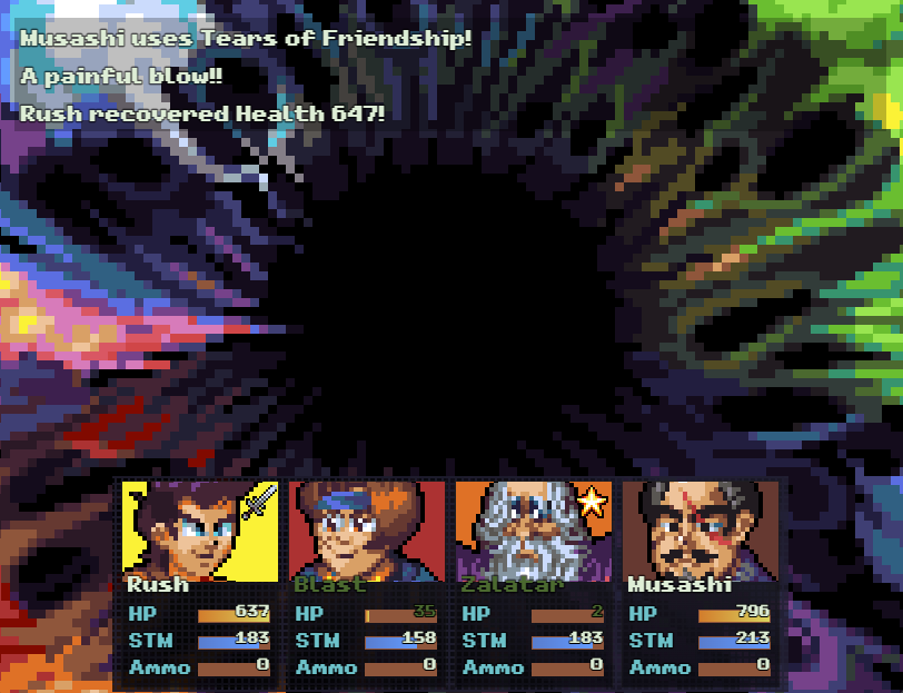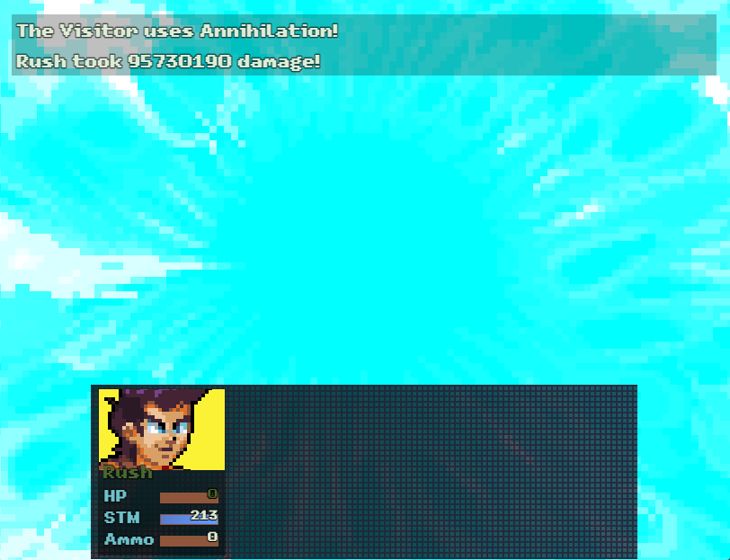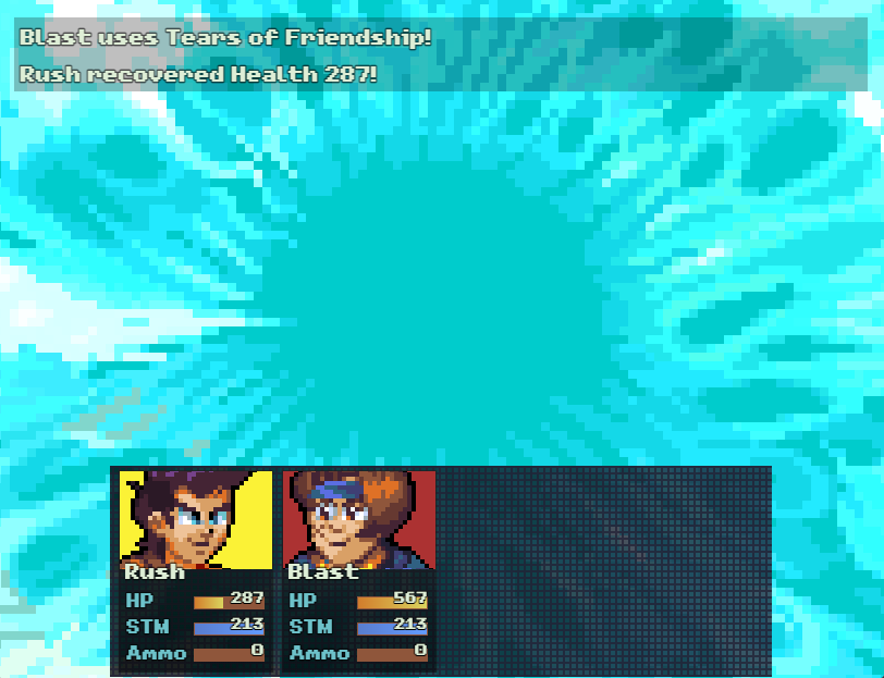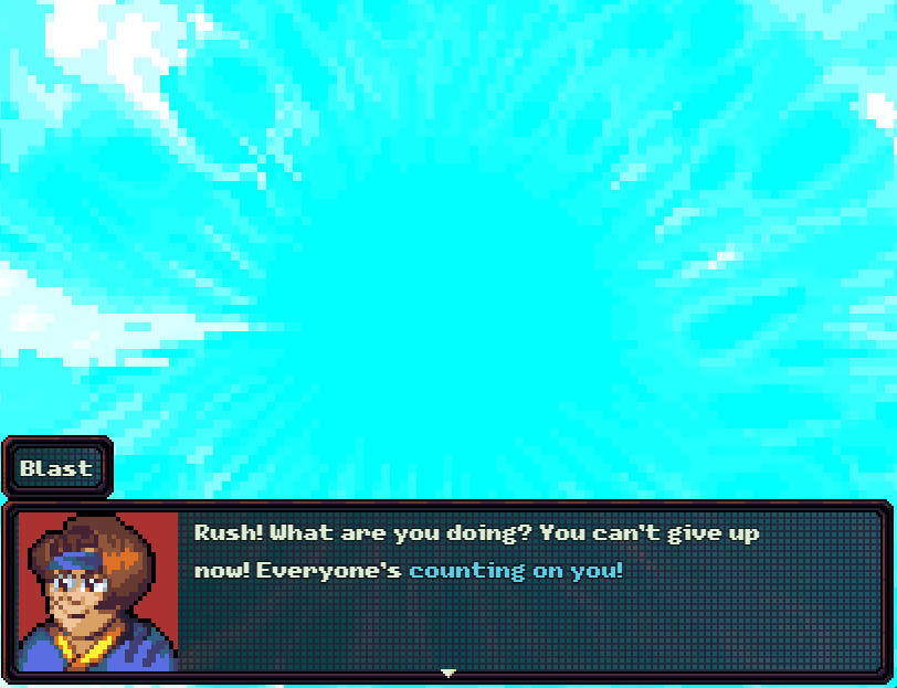 : “D-damn you!” : “R-Rush.. is that you? I.. I can’t see. I don’t think.. I’m gonna.. make it… don’t let them.. have this…” : “Blast, nooooooooo!”A boss battle begins. Ominous and kind of rockin’ boss music plays. But it doesn’t last long. The strange man takes out Rush and Blast in a single hit each.