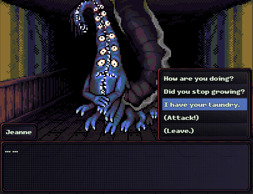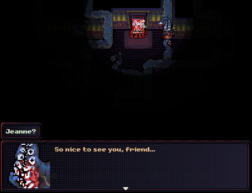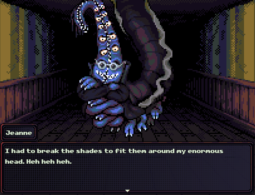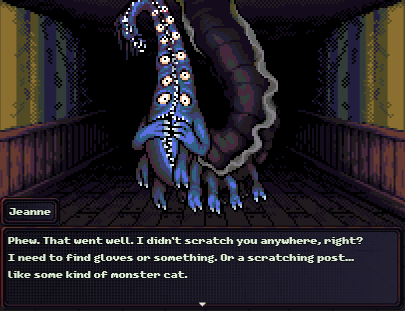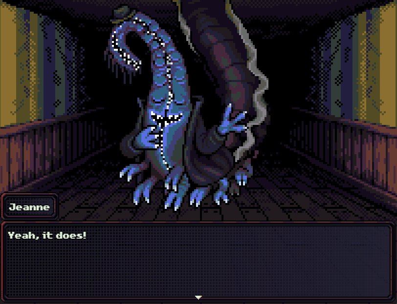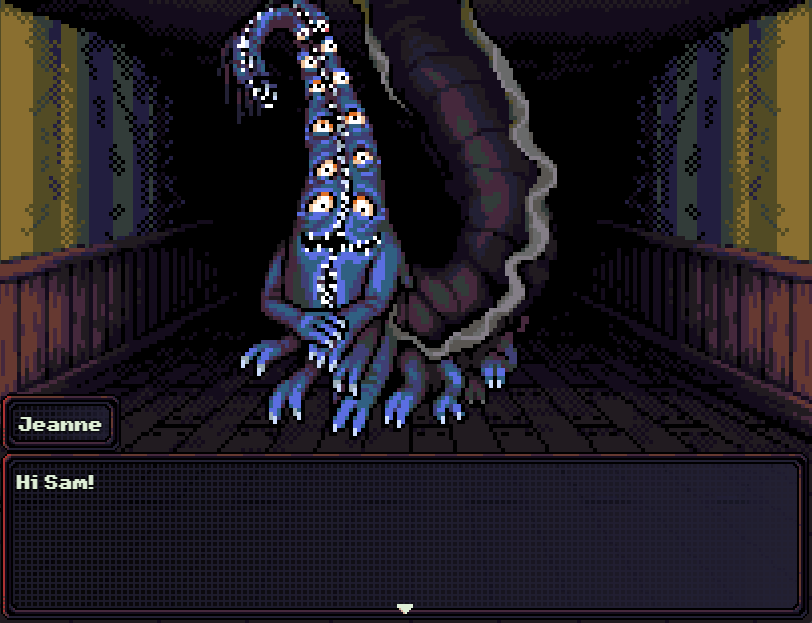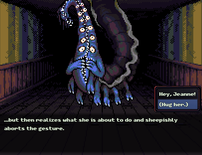 : We can visit Jeanne the next day, and the dialog auto-advances which is really annoying. She’ll try to hug Sam.