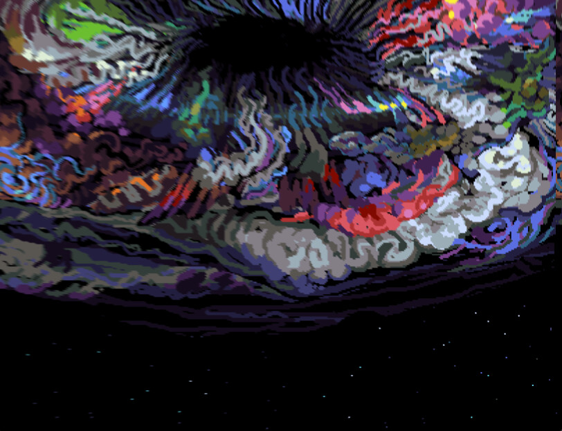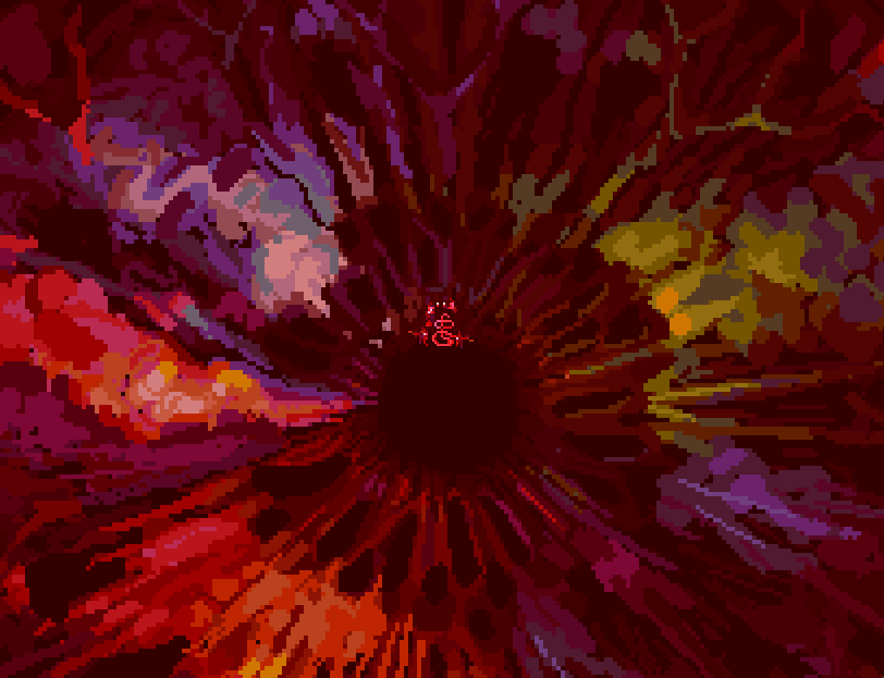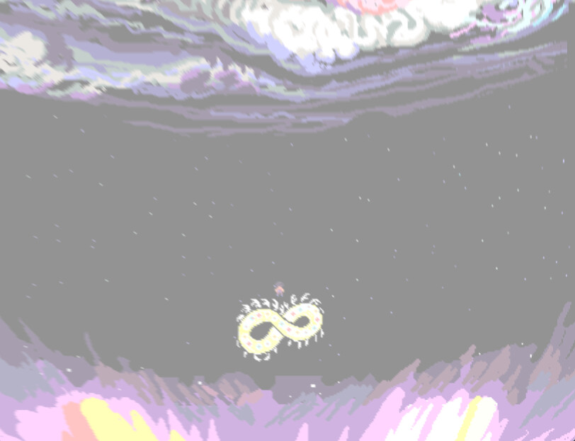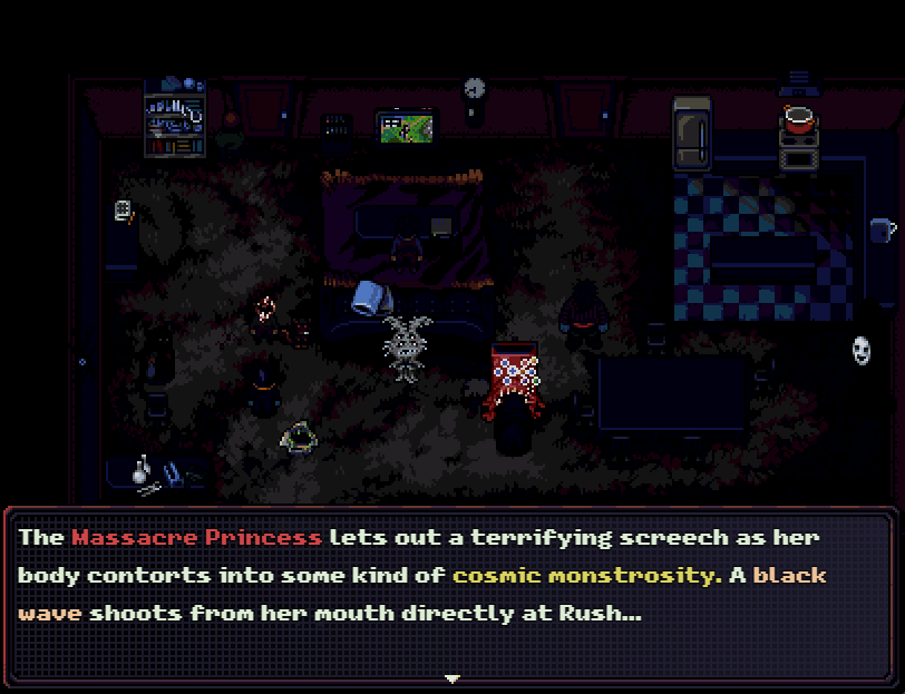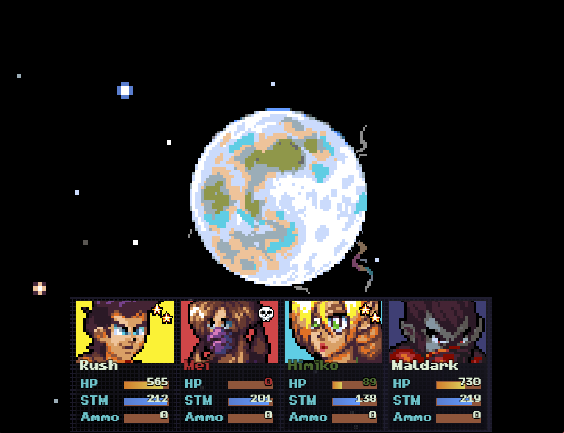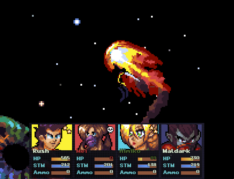 A boss battle begins; as you fight the Massacre Princess, the background warps through time and space. Stars and planets explode in the distance as energetic anime prog-rock plays.