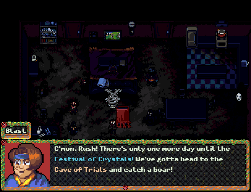 Rush and Blast set off for the cave in search of a boar. Predictably, the cave is filled with all kinds of creatures that you have to fight in turn-based combat. Eventually, you find a boar. It’s a tough boss fight.