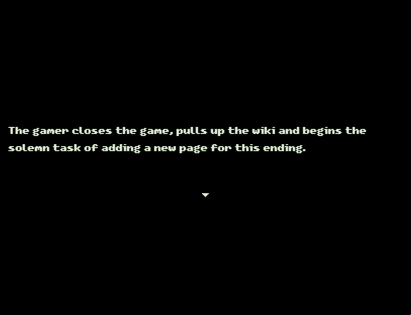 The gamer closes the game, pulls up the wiki and begins the solemn task of adding a new page for this ending. Grimly, with a heavy heart, he labels the page correctly as “Final True Ending” and begins writing out the events that just transpired.