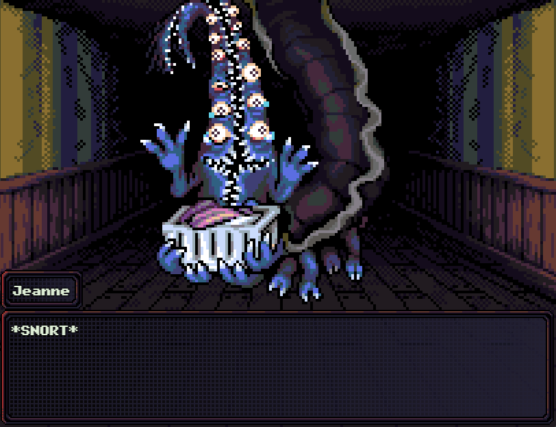 : Huh? What? What was I doing again? : …Sam? : I think he’s in some kind of self-induced fugue state. His mind’s cleaning up the mess, as it were. : It happens every time he thinks about clowns. : How did I get here? Oh, right! Sybil, do you want to play this terrible anime JRPG I bought off a guy in a fedora? : Sam, how much did you pay for that? : $120. He tried to buy it back and then tried to give me his katana, but the katana’s name was Cat Piss in Japanese so I didn’t want it. : Sam, do you know what emulation is? : Emulation?