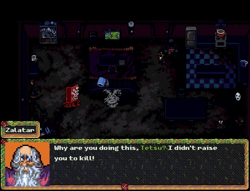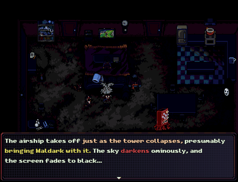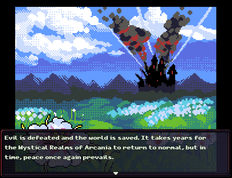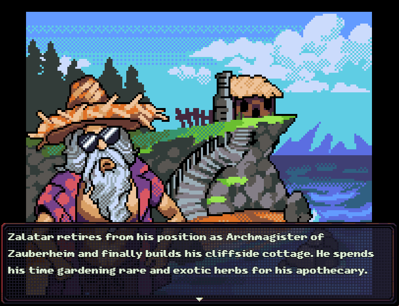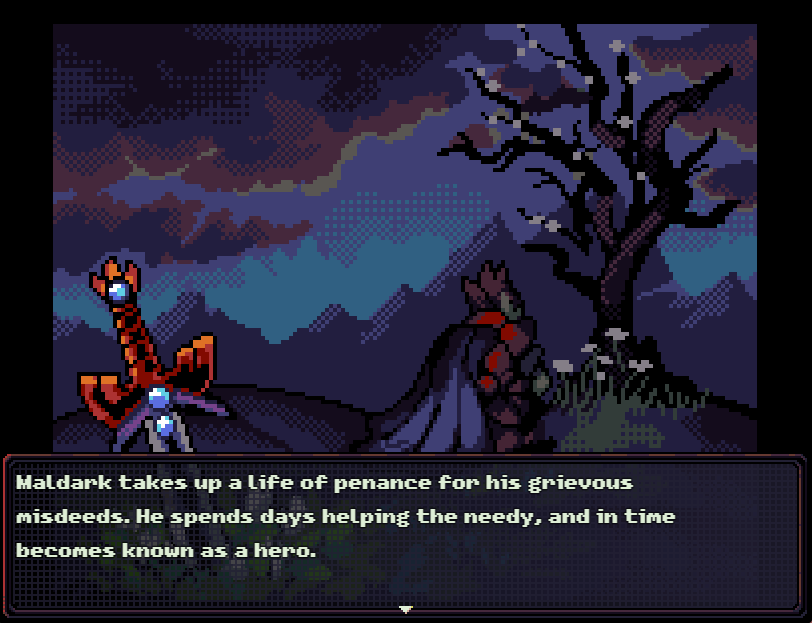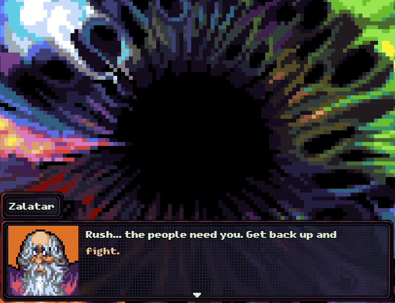 You watch a cutscene of the two battling. Zalatar is able to hold his own with magic, but alas - it’s not enough. Maldark cuts him down with his giant sword and takes the crystal from his body. Maldark confidently struts away from his fallen father, glimmering red energy coursing throughout his body. The screen fades to black.