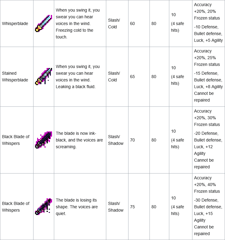 : The Whisperblade has four break stages and can’t be repaired. It gets stronger every time it breaks.