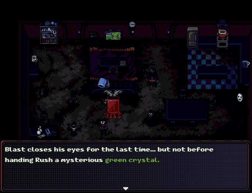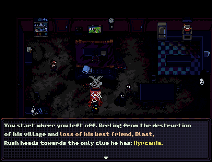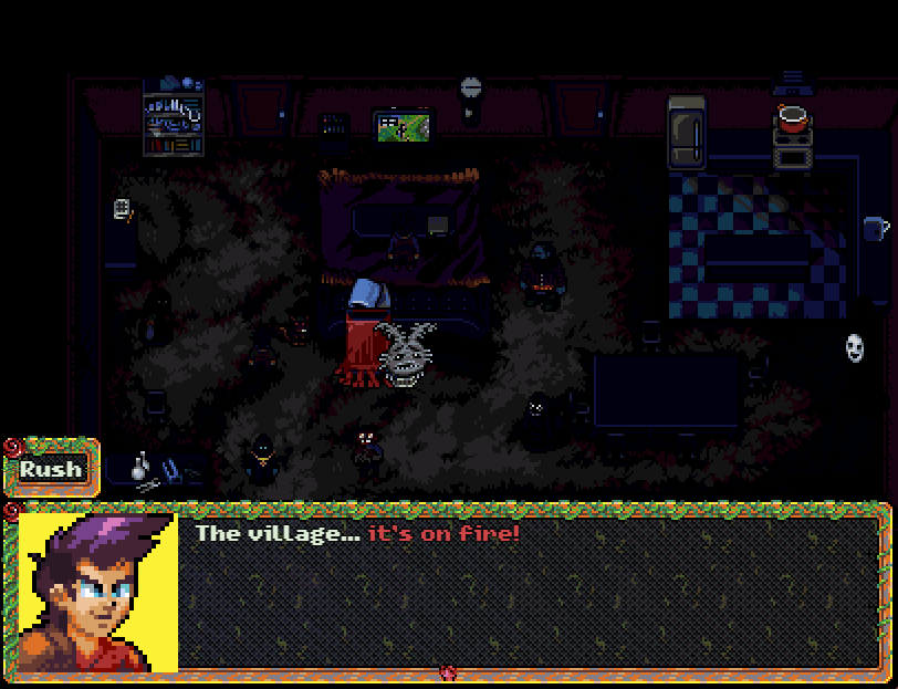 : “Wind Crystal? What’s that?!” : “Forget it, Rush! We’ve gotta get this guy!”You race back to the village, dropping the boar. The town is ablaze and bodies litter the streets. A tall man in a strange, black costume with a giant sword grins devilishly as you approach.