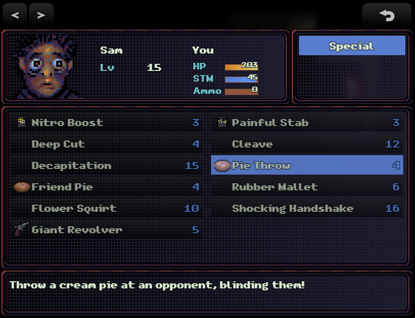 : And finally, Zondark. His skills are outright named after Magus’s skills from Chrono Trigger. He’s the only one to not be one of Sam’s party members.