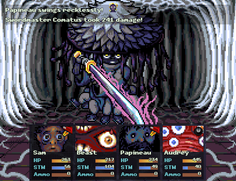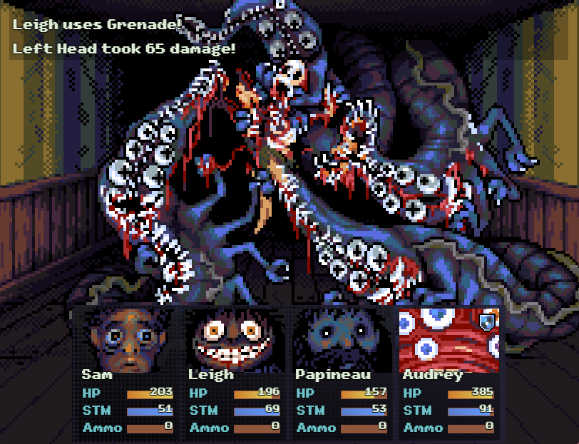 : The Visitor hits Sam for 9 million damage. Leigh, Papineau, and Audrey are nowhere to be found.