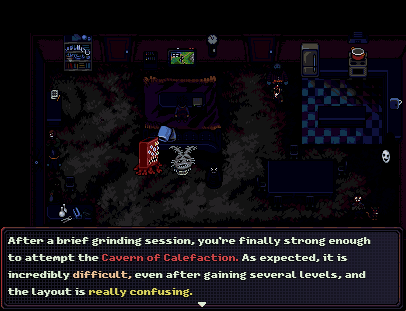 : “Rabu Rabu??”After a brief grinding session, you’re finally strong enough to attempt the Cavern of Calefaction. As expected, it is incredibly difficult, even after gaining several levels, and the layout is really confusing.