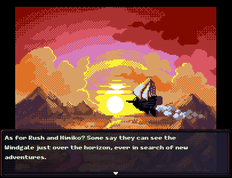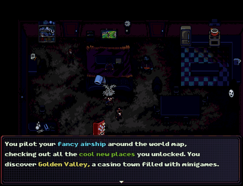 You pilot your fancy airship around the world map, checking out all the cool new places you unlocked. You discover Golden Valley, a casino town filled with minigames. You spend some time playing minigames until you’ve won some overpowered equipment. The best game is Rabu Racer, and the worst is definitely the skateboarding half-pipe.