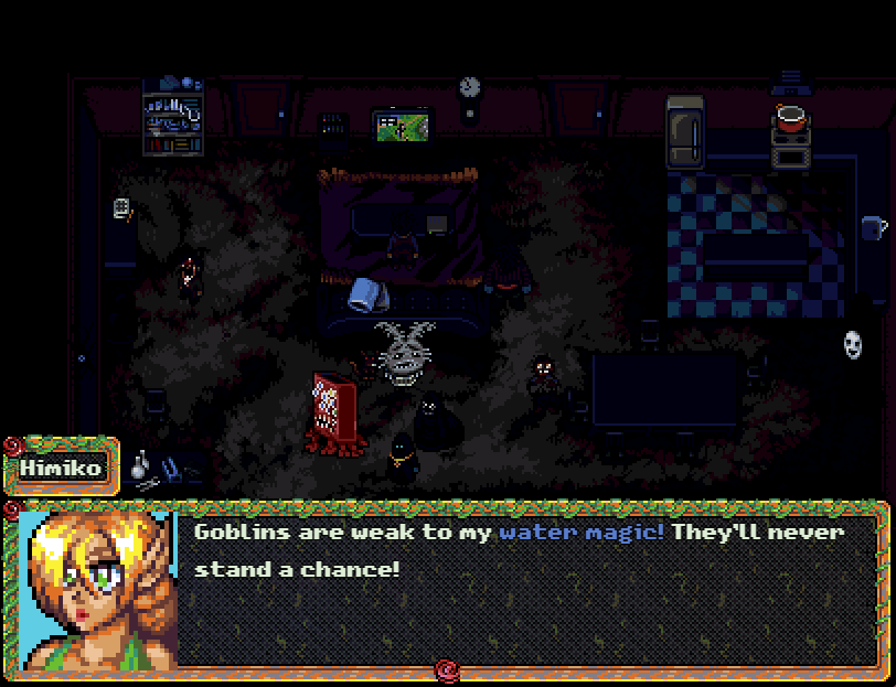 A boss battle commences. Himiko’s water magic, which had so far been useful for taking out goblins, is completely ineffective in the battle. You’re forced to rely on your items, and in the end you just barely win.