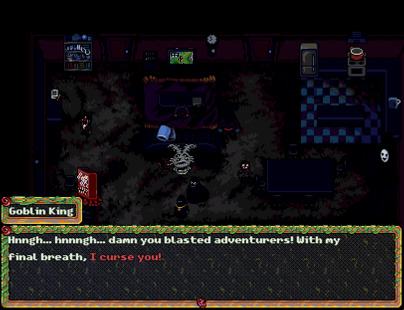 The three of you set out for the goblin cave, which is labyrinthian and filled with all kinds of traps and encounters. After a grueling slog, which requires about an hour of grinding to get through, you reach the boss: the Goblin King.