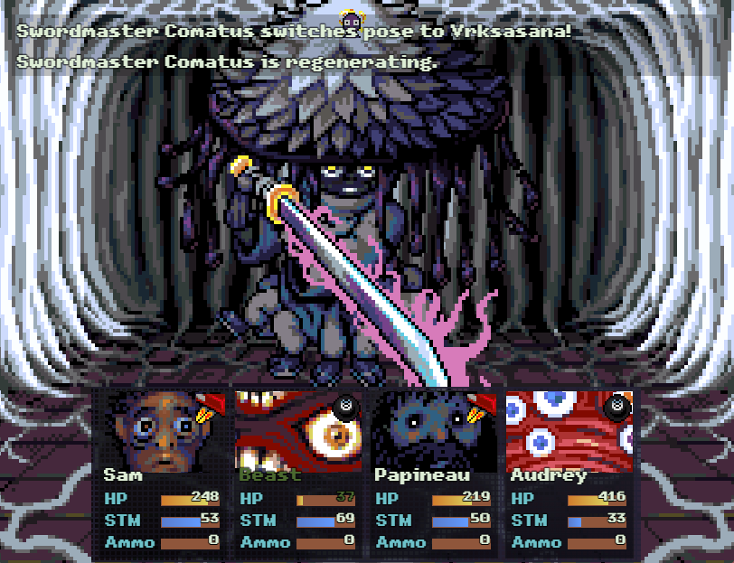 : After his first attack, Comatus begins his yoga routine with Tadasana. Tadasana gives him an 80% chance to counterattack when hit, and reduces incoming damage by 20%. Every time Comatus switches poses, he heals a little and purges all debuffs that aren’t Pain.