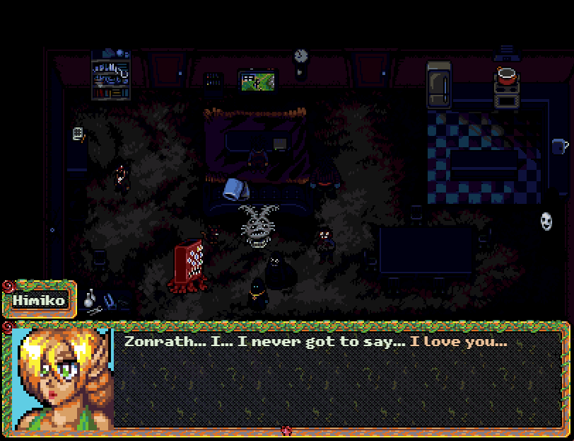 The man in black saunters off, leaving you and Himiko to regain your composure in the cave. A single tear trickles down Himiko’s eye as she holds Zonrath’s tattered body.