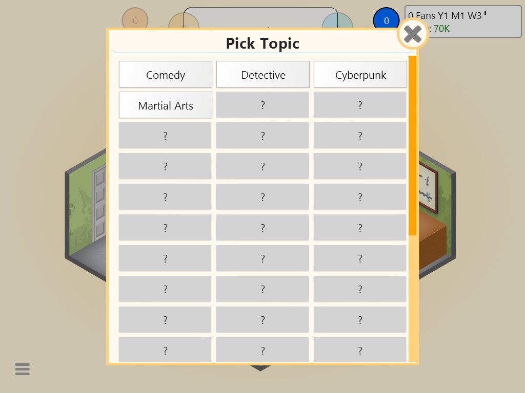 At the start, we only have 4 topics to choose from: Comedy, Detective, Cyberpunk, and Martial Arts