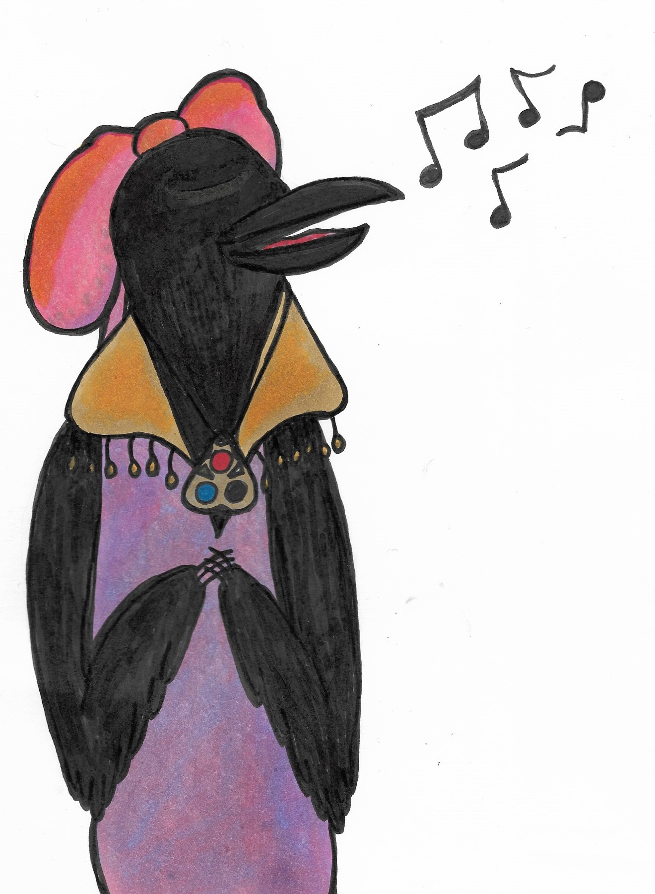 Apolena Noc is a Wotan (more commonly called "raven-folk") from the Wastes, and the self appointed "Ambassador of Dragons." A bard of the Three, it is Apolena’s goal to unite chromatic and metallic dragons, and, if you believe her, she’s been chosen by Aurum Rex to do so. A kind and gentle soul, she’d much rather talk than fight, but if push comes to shove, she’s more than capable of handling herself.