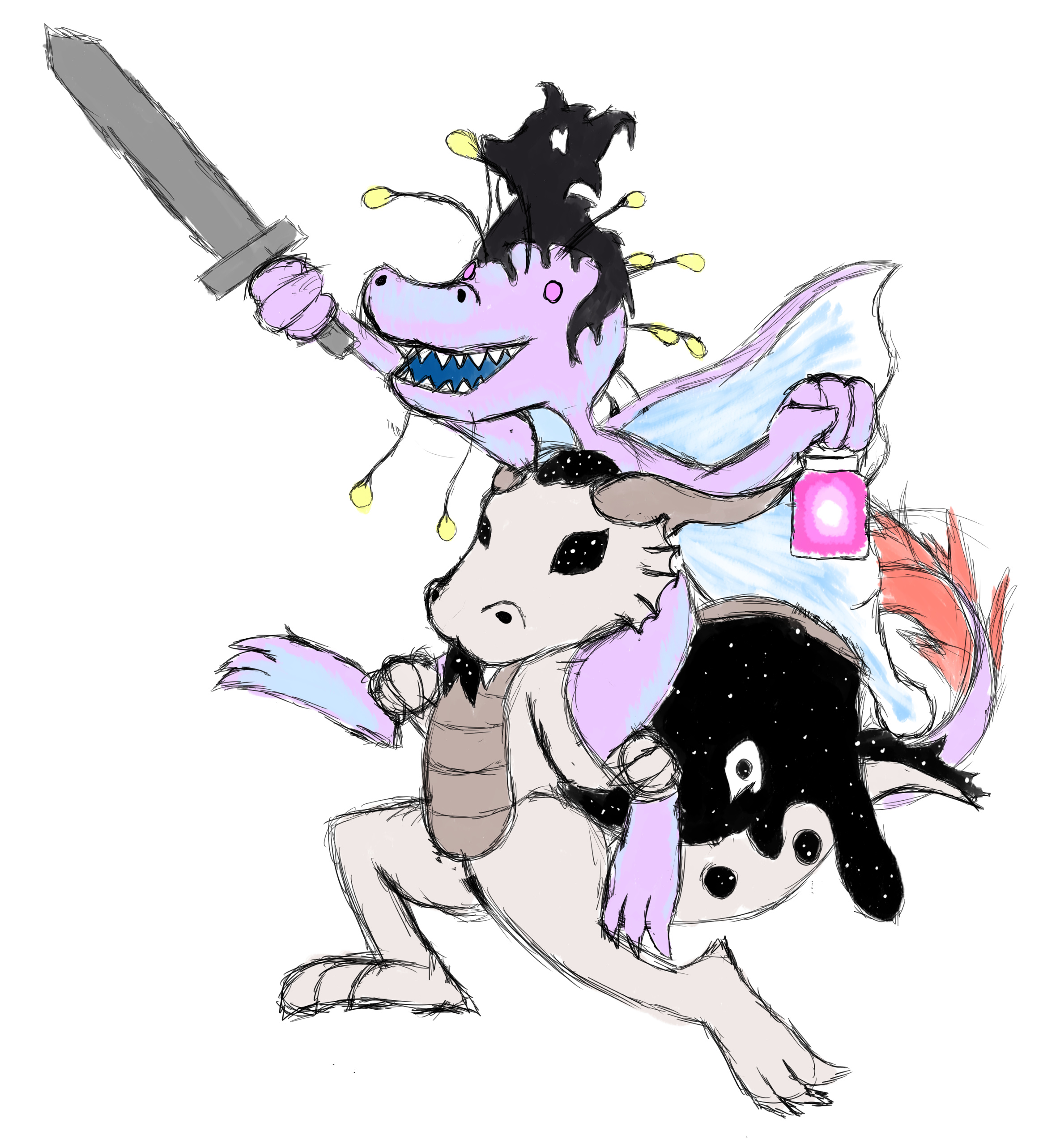 Sir Hughsnak is a fusion of the demon Hugh Manmon and the kobold Squire Shoesnak; taking from Squire’s carefree attitude and Hugh’s drive to protect his friends, Hughsnak will always be there for his friends, come Hell or high water. He’s brave, bold, caring, and a little uninspired (seriously, look at that name!), but most of all he’s a great friend.