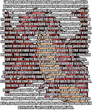 Arram: I’ve come to make an announcement. Lukas Redmon is a bitch ass motherfucker, he pissed on my fucking girlfriend. That’s right, he took his dragonborn fucking scaly dick out and he pissed on my fucking girlfriend, and he said his dick was “This Big” and I said “That’s disgusting” so I’m making a callout post on my Twitter.com. Lukas you got a small dick! It’s the size of this walnut except way smaller, and guess what? THIS IS WHAT MY DICK LOOKS LIKE! THAT’S RIGHT BABY! TALL POINTS, NO LOOSE SCALES, NO PILLOWS. LOOK AT THAT, IT LOOKS LIKE TWO BALLS AND A BONG! HE FUCKED MY GIRLFRIEND, SO GUESS WHAT? I’M GONNA FUCK THE EARTH! THAT’S RIGHT THIS IS WHAT YOU GET, MY SUPER LASER PISS! EXCEPT I’M NOT GONNA FUCK THE EARTH, I’M GONNA GO HIGHER. I’M PISSING ON THE MOOOOOOOON!!!